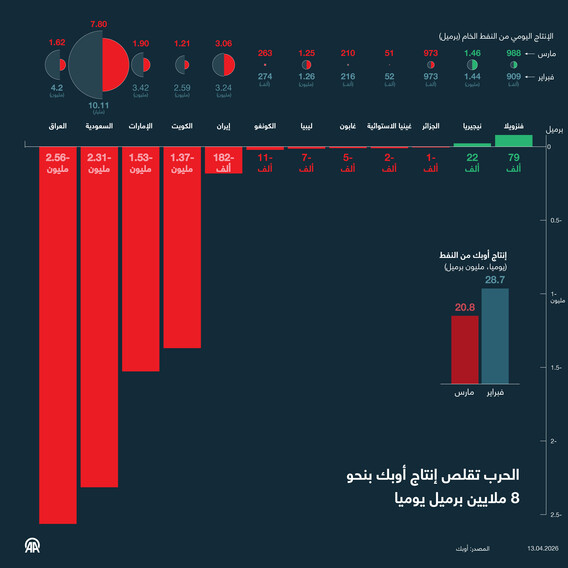 الحرب تقلص إنتاج أوبك بنحو 8 ملايين برميل يوميا