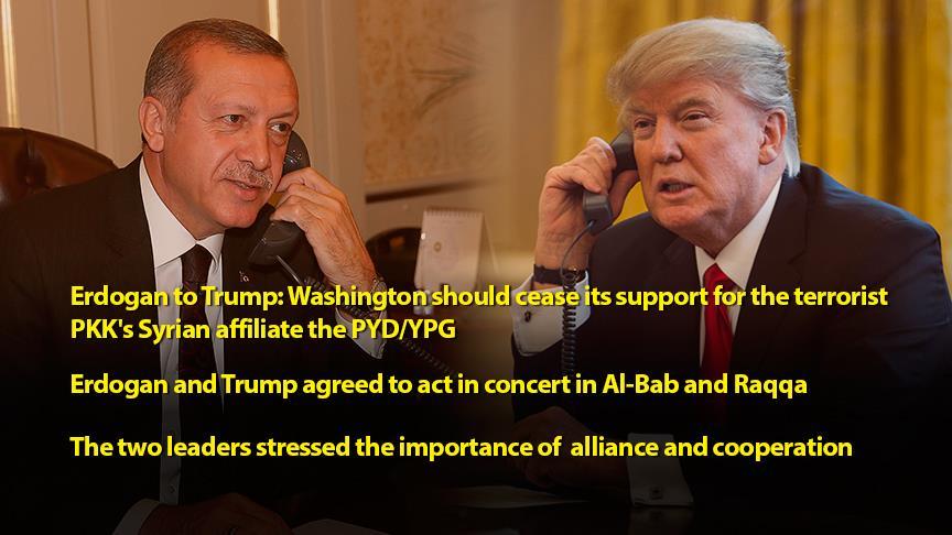 Turkish President Recep Tayyip Erdogan late Tuesday told U.S. President Donald Trump that Washington should cease its support for the terrorist PKK's Syrian affiliate the PYD/YPG, according to presidential sources.