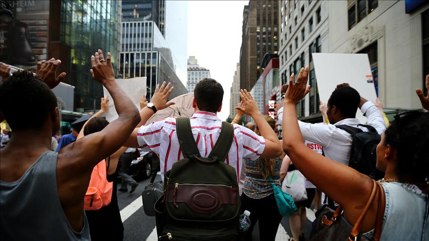 Demonstrators flooded the streets of York City late Thursday, marching against police brutality in the wake of three consecutive days of fatal police-involved shootings that claimed the lives of young black men across the country.