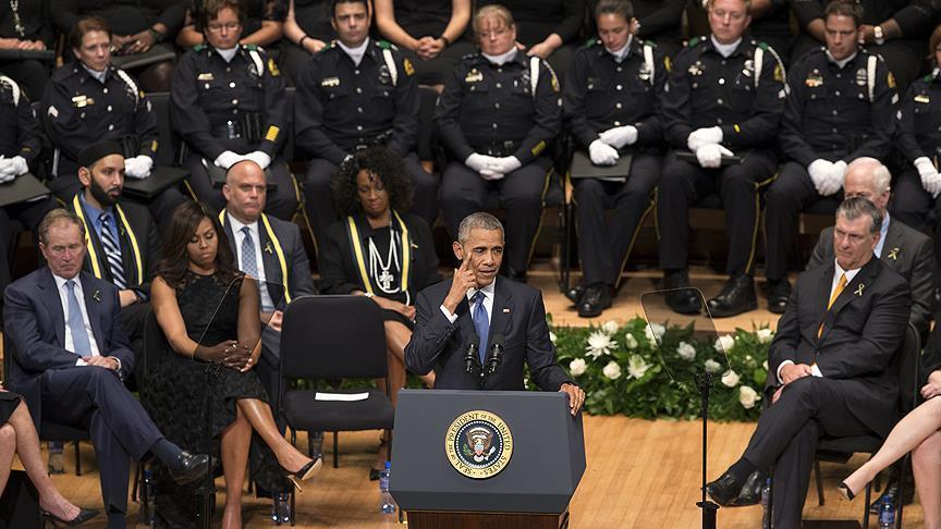 President Barack Obama on Tuesday urged Americans to unite while acknowledging deep divisions in American society amid national unrest following the killings of black men by police officers and the shooting deaths of five officers.