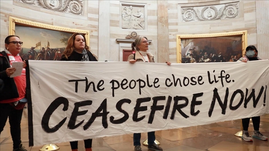 They also carried banners that said "The people chose life. Cease-fire now!," "Protect Immigrant Asylees" and "Divest from Militarism, Invest in Life.”