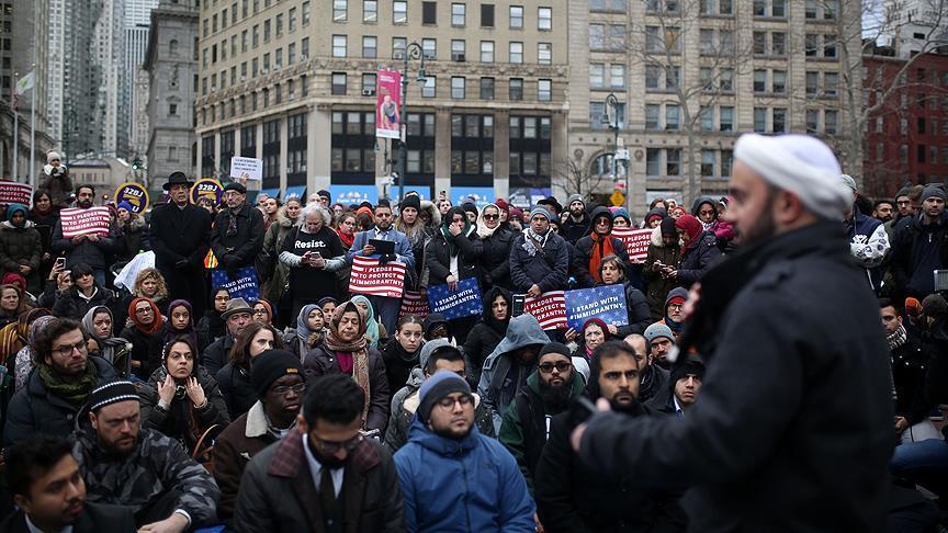 Dozens lined up for prayer Friday at New York City's Foley Square in a peaceful protest against President Donald Trump's executive actions that target refugees and undocumented immigrants.