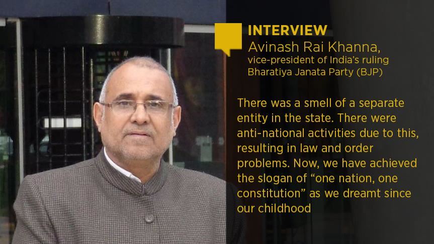 “There was a smell of a separate entity in the state. There were anti-national activities due to this, resulting in law and order problems. Now, we have achieved the slogan of “one nation, one constitution” as we dreamt since our childhood, said Avinash Rai Khanna, vice-president of BJP, in an exclusive conversation with Anadolu Agency on eve of the first anniversary of India’s revocation of the special status of Jammu and Kashmir.