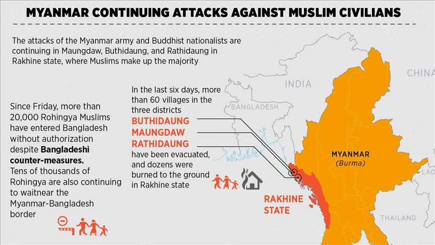 The source, who asked not to be named due to security concerns, said the attacks of the Myanmar army and Buddhist nationalists are continuing in Maungdaw, Buthidaung, and Rathidaung in Rakhine state, where Muslims make up the majority.