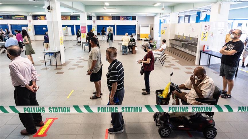 SINGAPORE, SINGAPORE - JULY 10: Singaporeans go to the polls to cast their votes in the 2020 General Election in Singapore, Singapore on July 10, 2020. Polling centers and agents assist voters, who need to wear masks, with temperature checks and social distancing as they queue for their turn to vote in Singapore. ( Zakaria Zainal - Anadolu Agency )