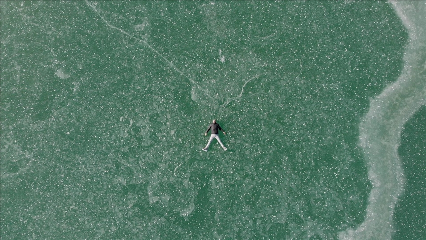 BAYBURT, TURKEY - JANUARY 03: A man lies on frozen Gokceder Pond after the air temperature dropped below zero during winter season in Bayburt, Turkey on January 03, 2021. ( Beşir Kelleci - Anadolu Agency )