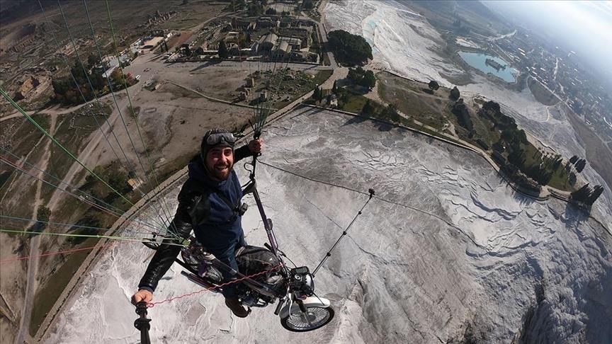 Turkish paraglider flies with motorcycle over Pamukkale