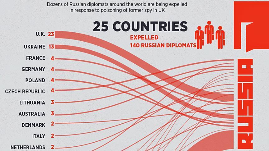 According to information gathered by Anadolu Agency, a total of 25 countries have expelled 140 Russian diplomats. These numbers are expected to increase in the coming days.