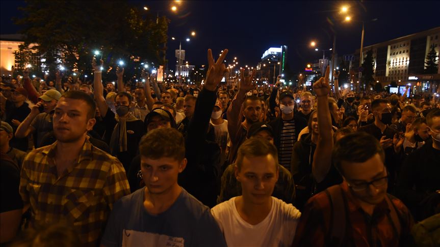 MINSK, BELARUS - AUGUST 10: Protestors continue their unauthorized demonstrations at streets despite police intervention, after the early election results in Minsk, Belarus on August 10, 2020. Belarusian President Alexander Lukashenko won a sixth term in office with over 80% of the vote, the country's election commission said Monday. Officials maintain the results are valid, however, the opposition candidates protested the results, supported by thousands of people who took to the streets throughout the country. ( Marina Serebryakova - Anadolu Agency )