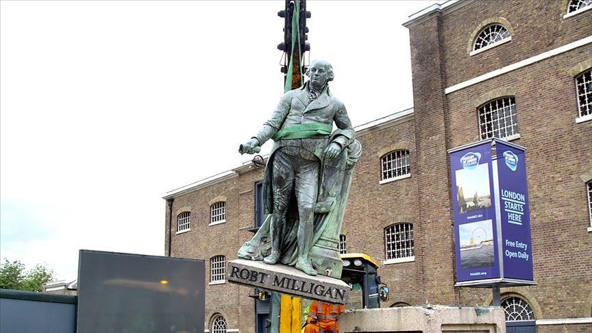 A statue of 18th century British slave trader Robert Milligan was also removed from outside the Museum of London Docklands Tuesday afternoon.