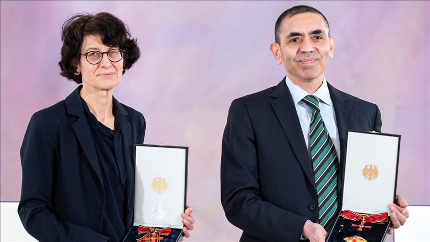 Germany’s president conferred Turkish scientists Ugur Sahin and Ozlem Tureci with the country’s highest award on Friday for inventing the world’s first effective vaccine against COVID-19.