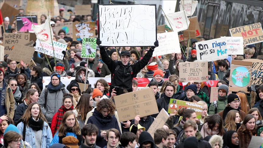 Students chanted slogans and carried colored banners calling on the government to prioritize policies combating global warming and climate change.