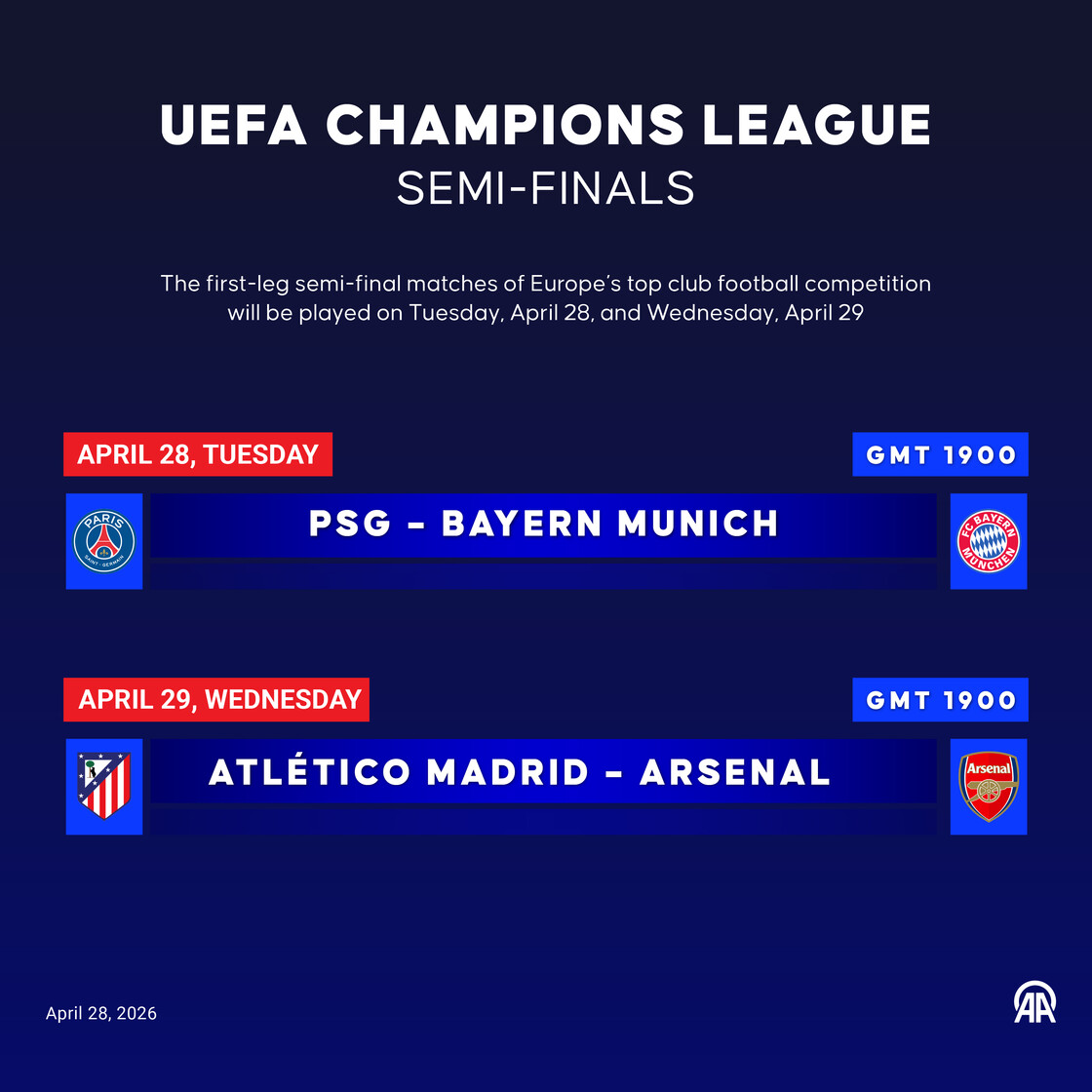 The first-leg semi-final matches of Europe’s top club football competition will be played on Tuesday, April 28, and Wednesday, April 29.