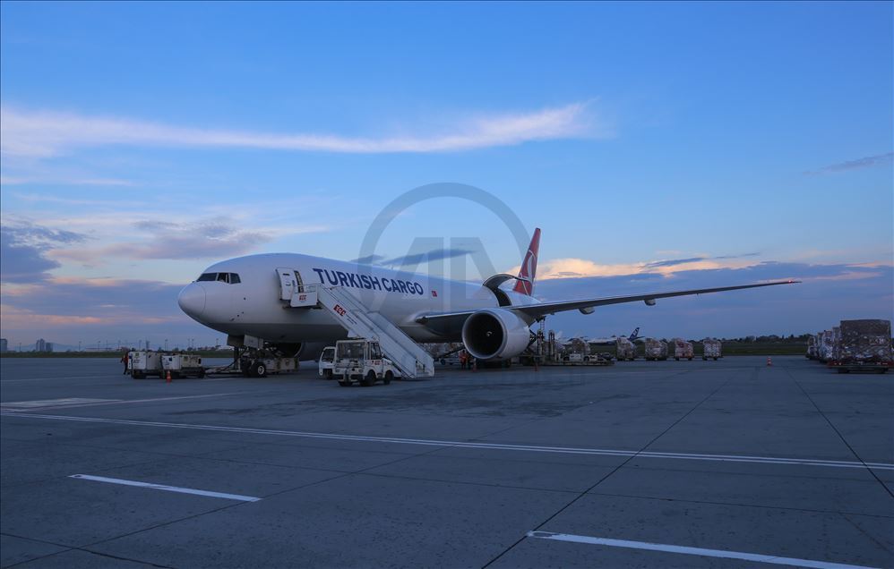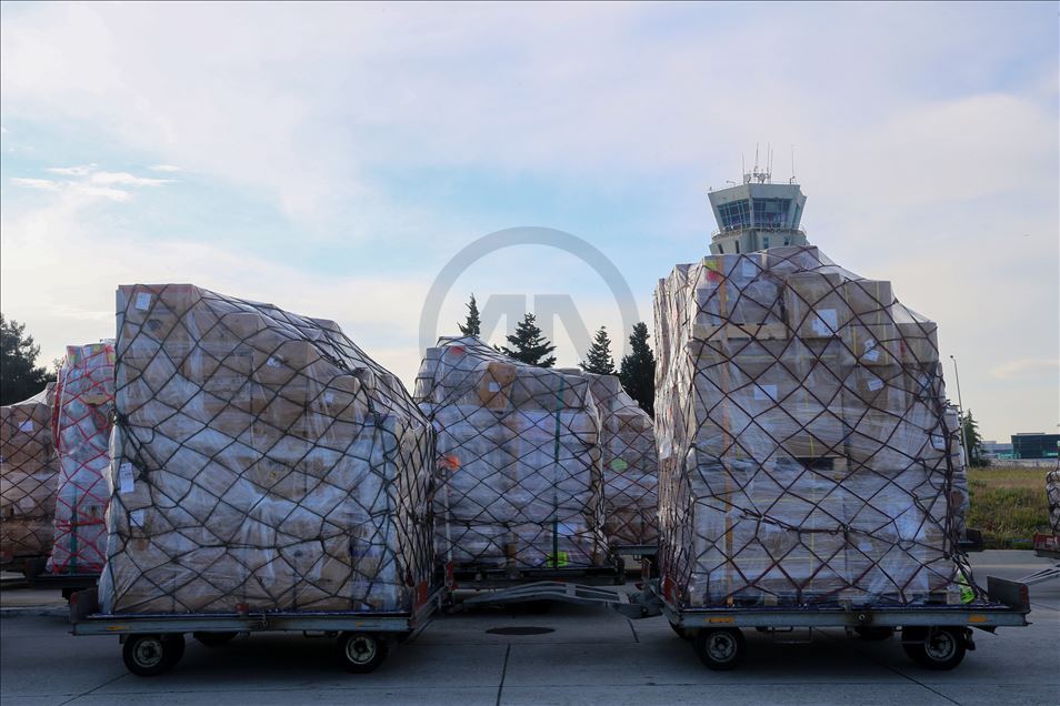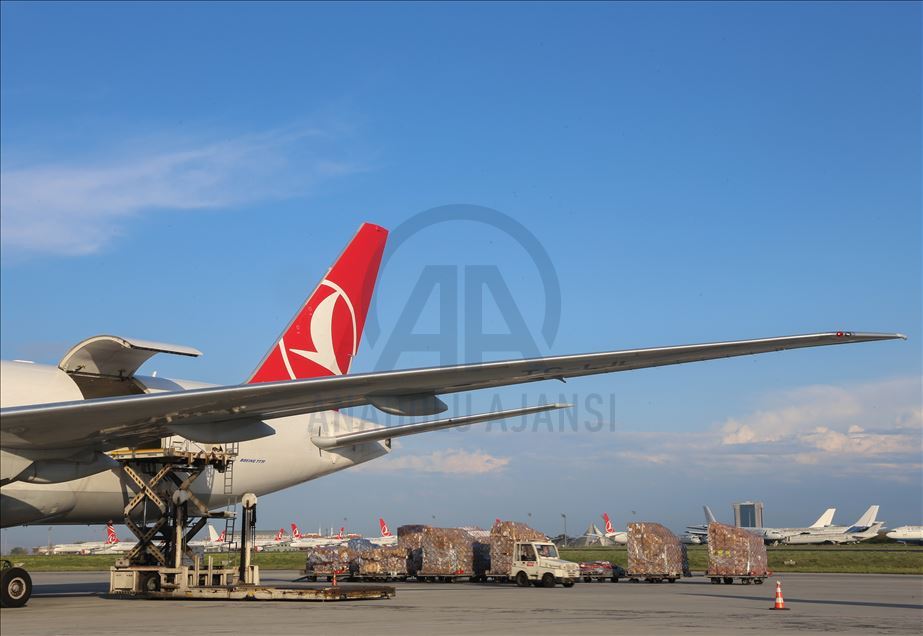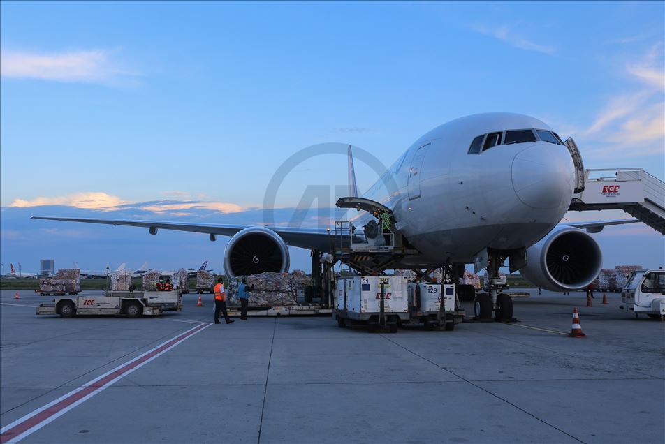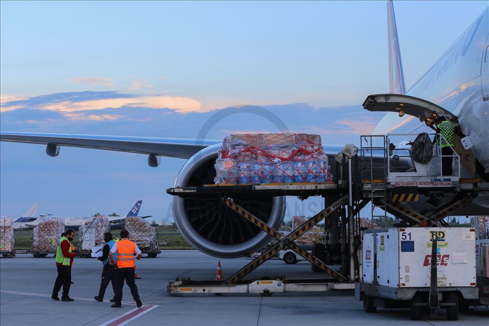 ISTANBUL, TURKEY - APRIL 30: Medical equipments, which Turkey prepared to send to Palestine, includes 40 thousands diagnostic kits, 100 thousands N95 mask, 40 thousands suit, 100 thousands gloves, 20 thousands safety goggles, 2 thousands litres disinfectant, 20 thousands nasal oxygen cannulas, 2 thousands oxygen mask and 4 PCR equiments are being loaded to a plane to be sent to Palestine from Istanbul, Turkey on April 30, 2020. ( Esra Bilgin - Anadolu Agency )