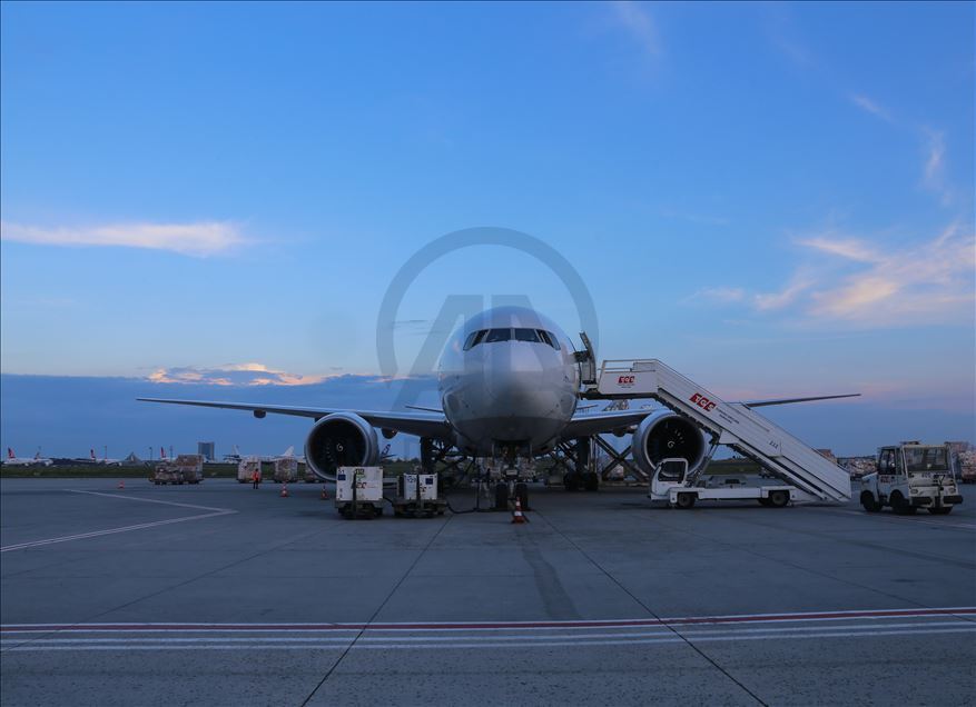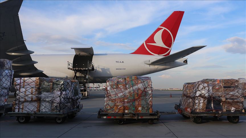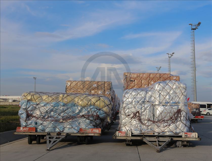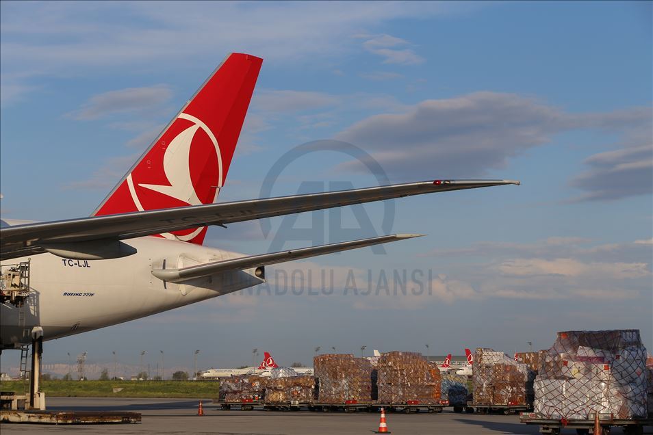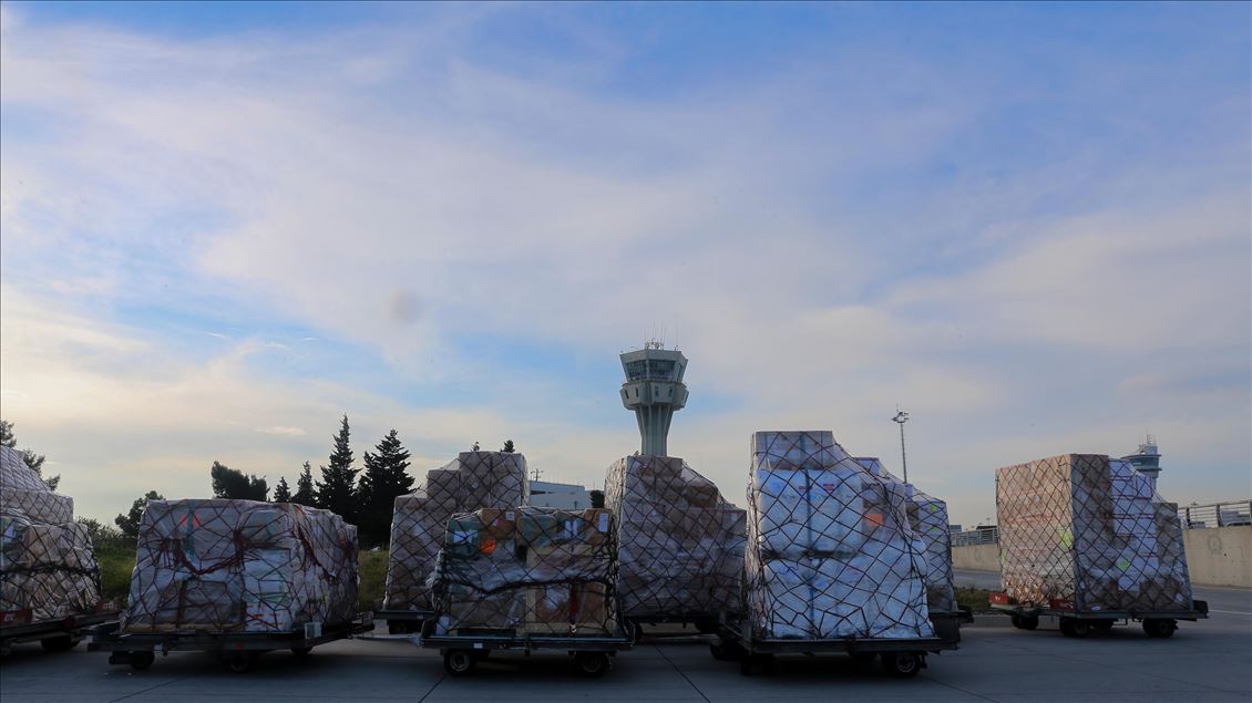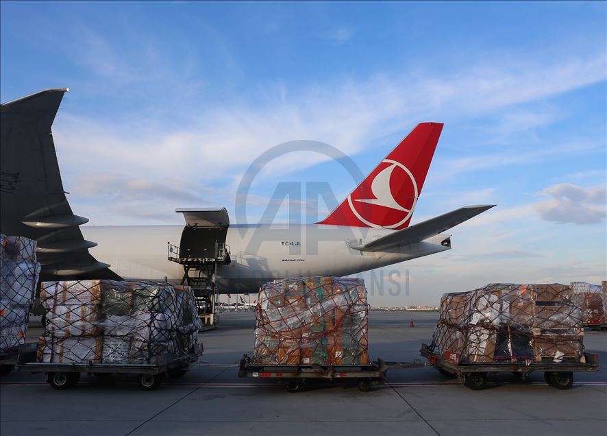 ISTANBUL, TURKEY - APRIL 30: Medical equipments, which Turkey prepared to send to Palestine, includes 40 thousands diagnostic kits, 100 thousands N95 mask, 40 thousands suit, 100 thousands gloves, 20 thousands safety goggles, 2 thousands litres disinfectant, 20 thousands nasal oxygen cannulas, 2 thousands oxygen mask and 4 PCR equiments are being loaded to a plane to be sent to Palestine from Istanbul, Turkey on April 30, 2020. ( Esra Bilgin - Anadolu Agency )