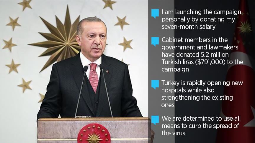 Turkey's president on Monday launched a National Solidarity Campaign to aid fight against the novel coronavirus, donating seven of his monthly salaries to the initiative.