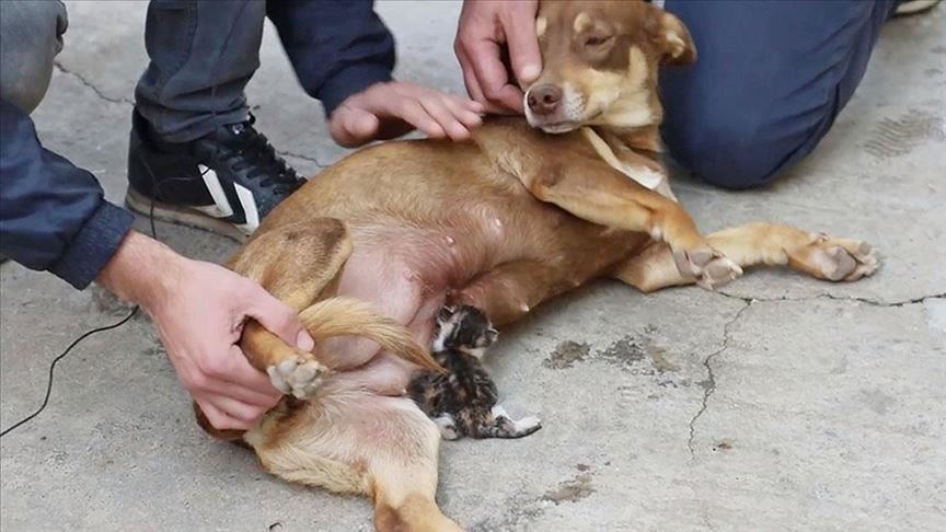 An abandoned kitten was adopted and breastfed by a pregnant dog in Turkey's southwestern Mersin province.