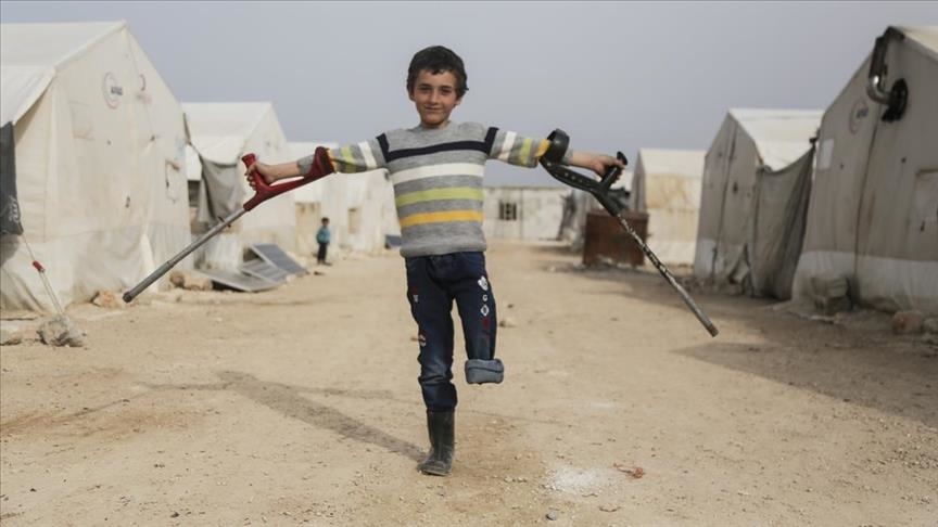 "I was 5 years old when I was injured. My leg was hit by shrapnel while I was playing,” the 10-year old boy told Anadolu Agency. “My grandmother took me to the hospital. I saw that my leg was severed. Now I am using crutches to walk,” he said.