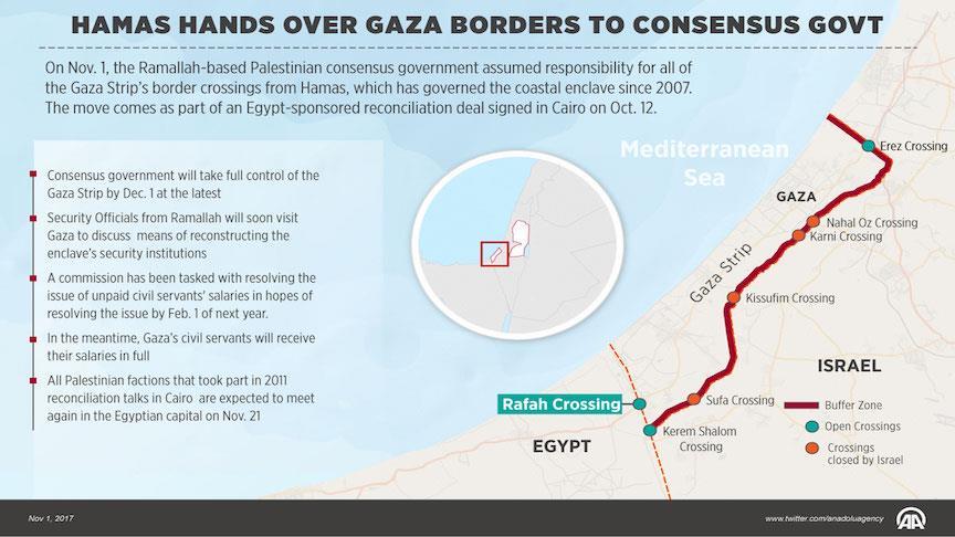 “Based on the decision of [Palestinian] President Mahmoud Abbas, we are here today in the Gaza Strip to take over the border crossings, on the path of reconciliation and reunification of the Palestinian people,” Mufid al-Hasayneh, Minister of Housing and Public Works, told a press conference held at the Rafah crossing border.