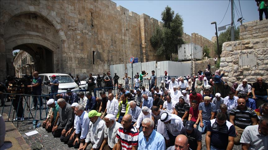 Palestinians packed the narrow alleyways leading to Jerusalem's Al Aqsa mosque on Monday, as hundreds prayed at the threshold, refusing to enter for a second day in protest against new Israeli security measures.