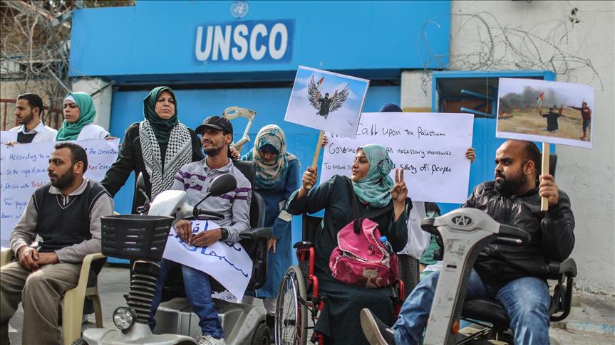 Held outside UNESCO’s Gaza City office, the demonstration was organized by the National Center for Community Rehabilitation (NCCR), a local NGO.
