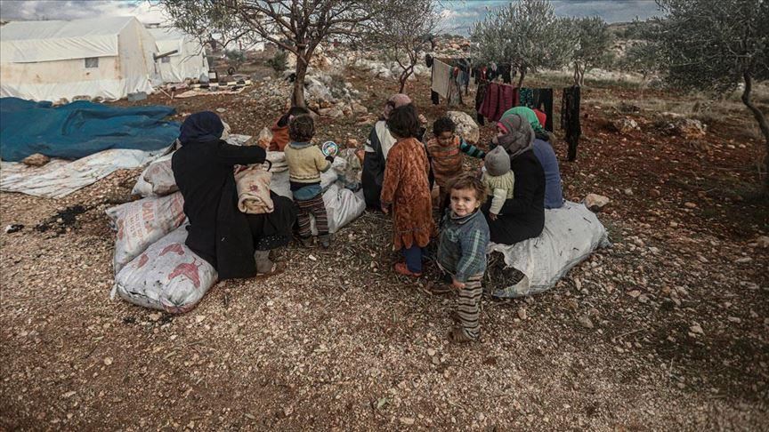 IDLIB, SYRIA - DECEMBER 28: Syrian families, who have been forced to displace despite attacks carried out by Assad regime and Russia, sit on soil field despite the cold weather during winter season at Harbanush village in Idlib, Syria on December 28, 2019. They couldn't find any tent to take shelter in due to the lack of accommodation. ( Muhammed Said - Anadolu Agency )