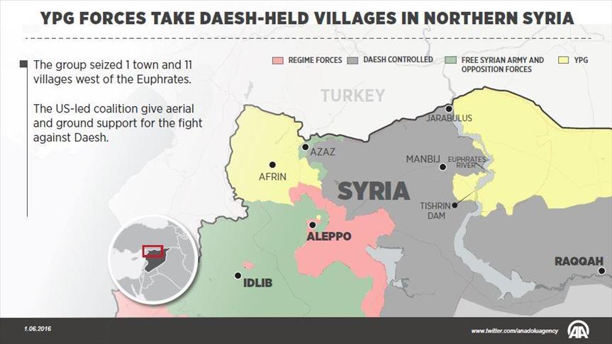 The YPG, which is the Syrian affiliate of the Turkey-based PKK, took settlements between the river and the strategically important town of Manbij, Turkmen sources said on condition of anonymity due to security concerns.