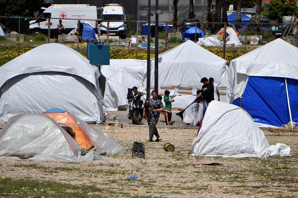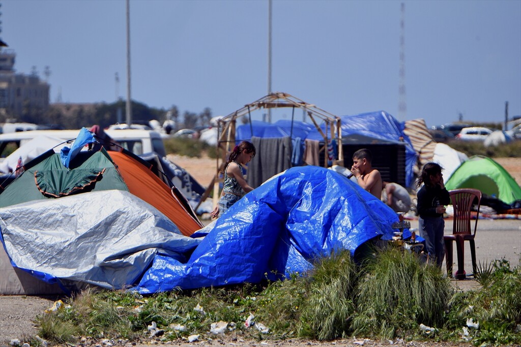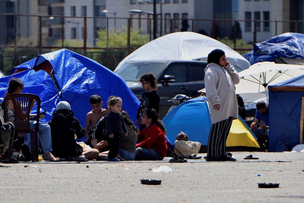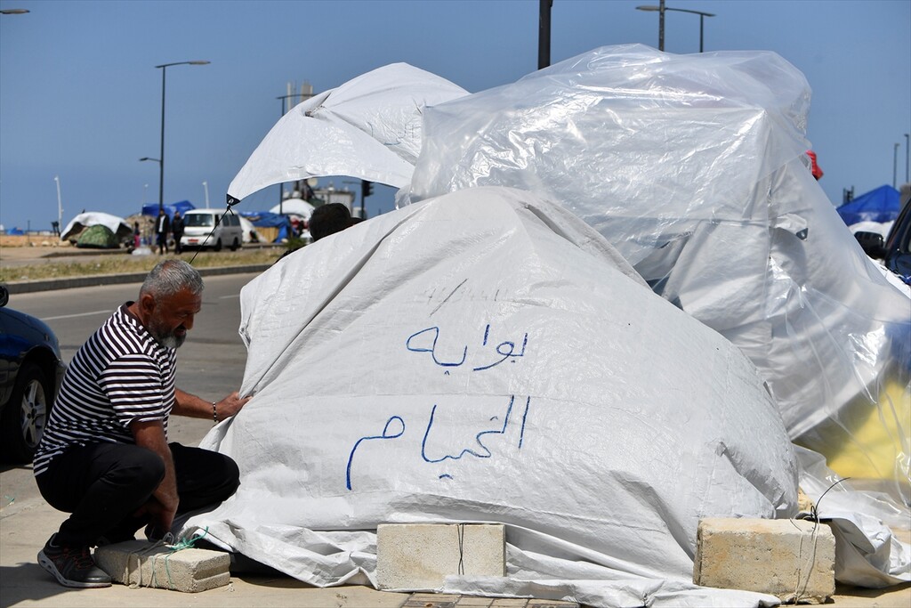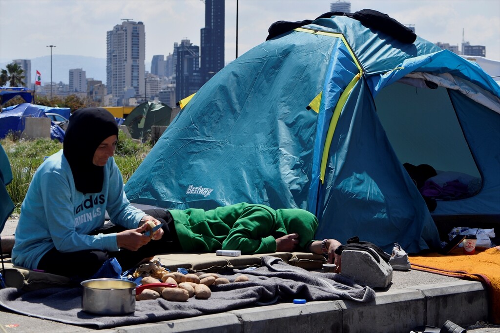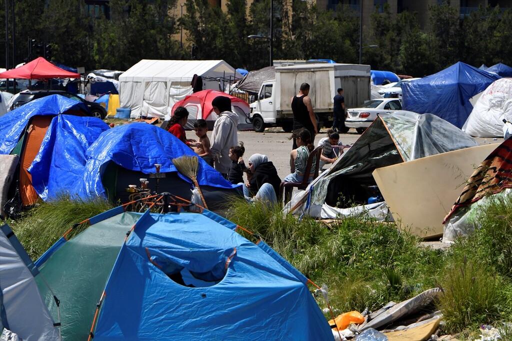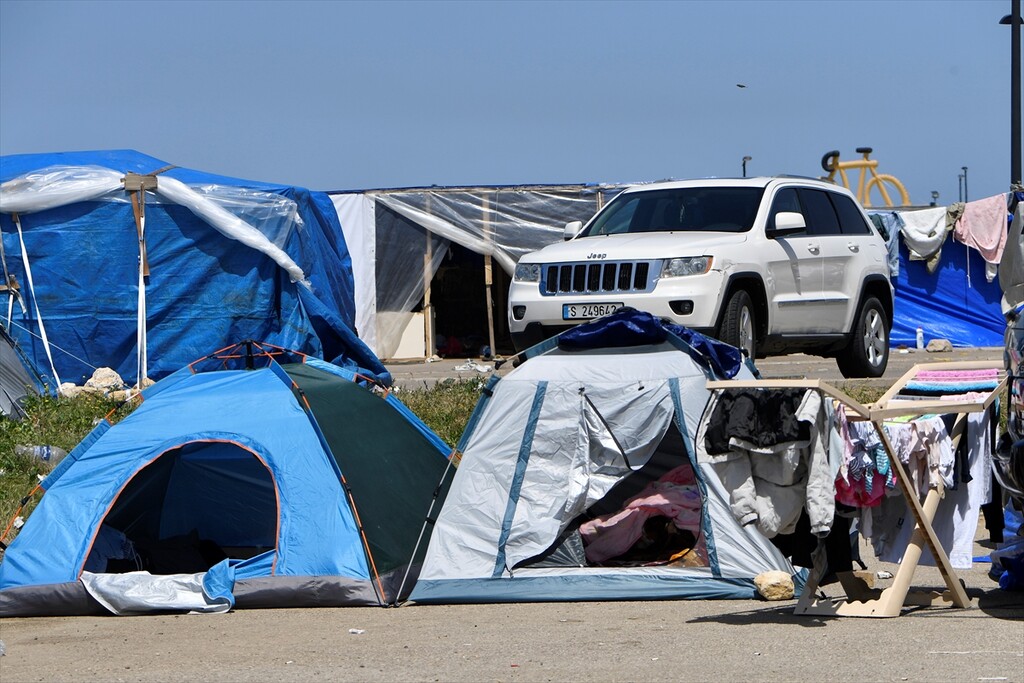 Displaced Lebanese staying in tents are seen in the Raouche area in Beirut, Lebanon on April 13, 2026.