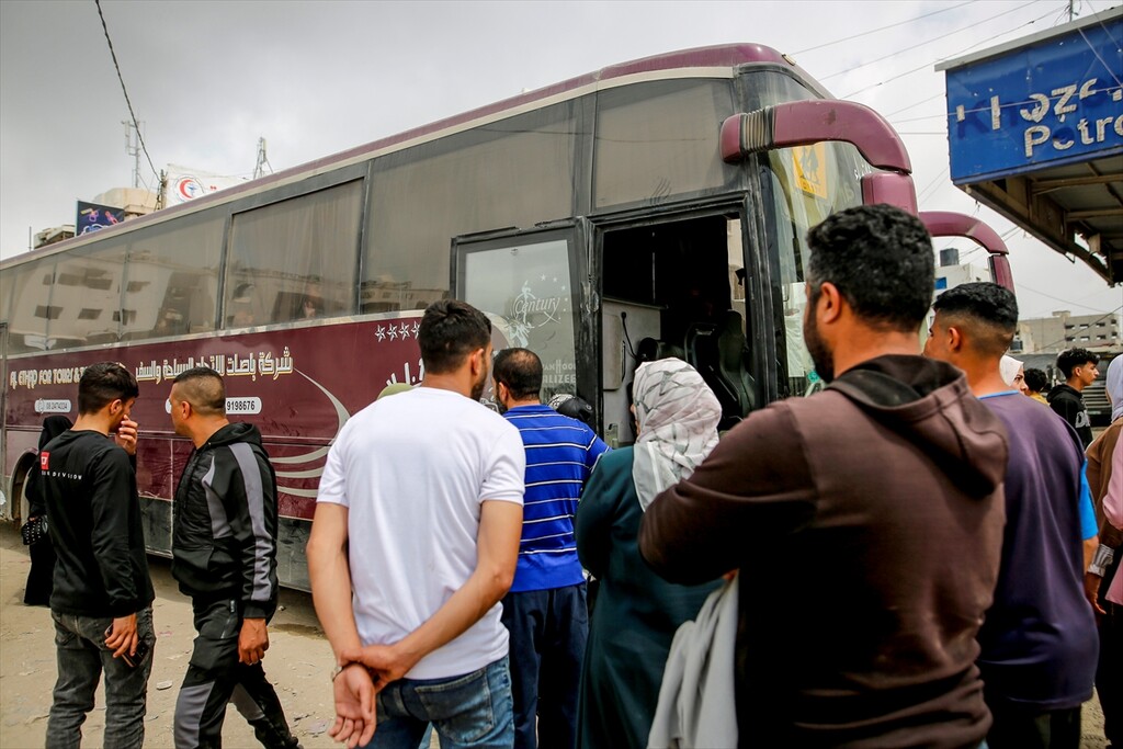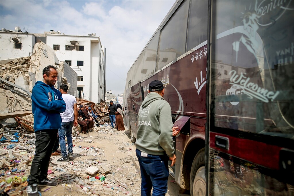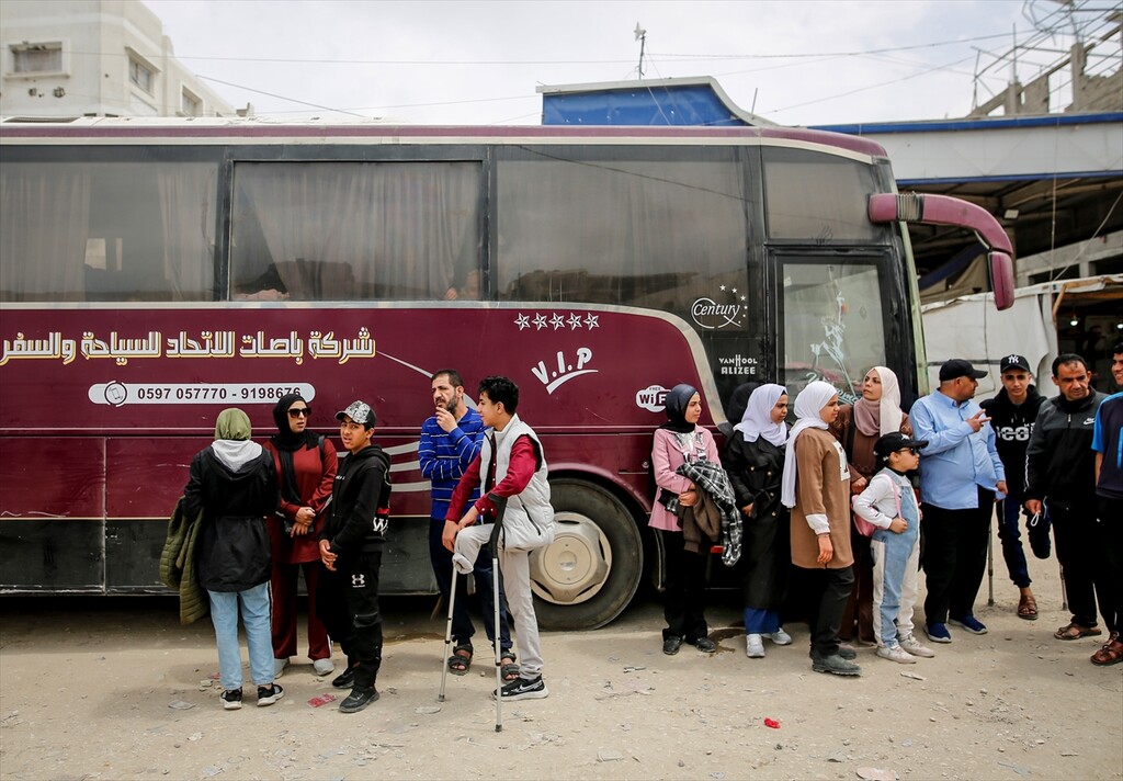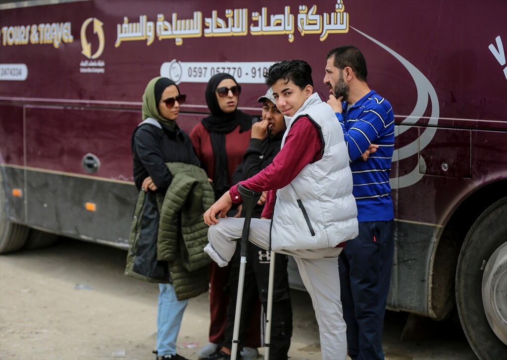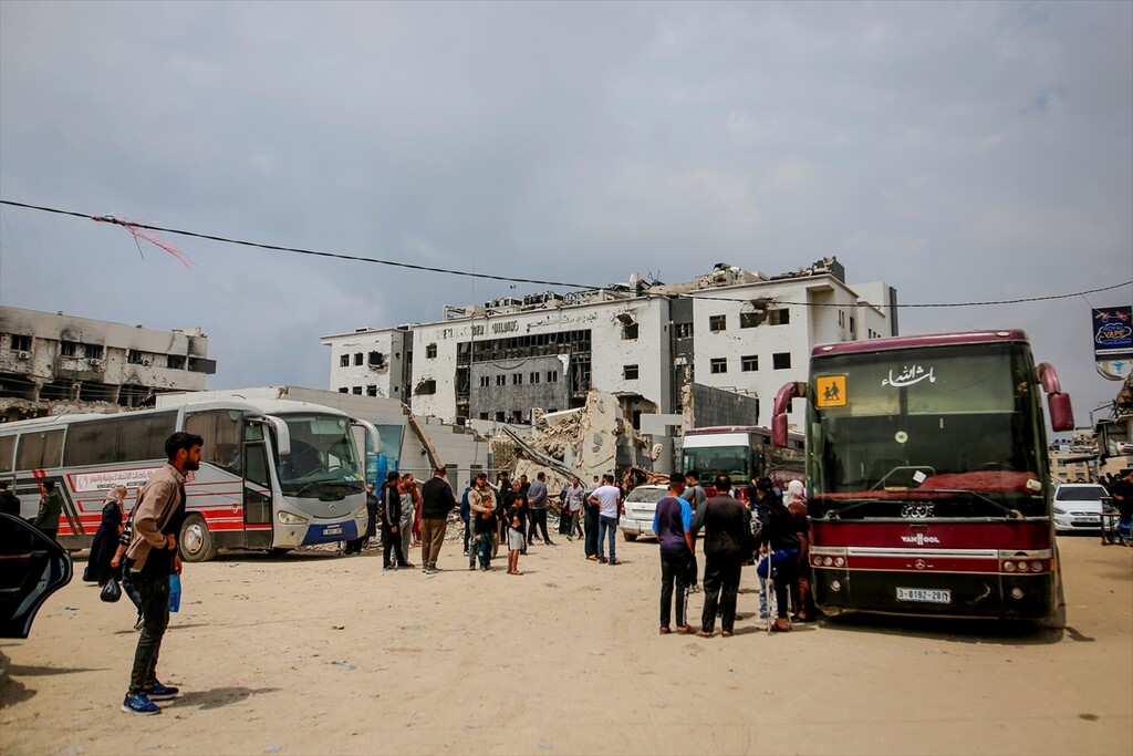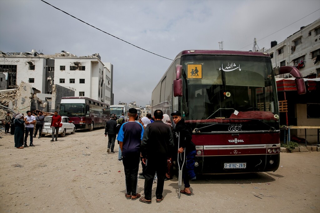 A group of Palestinian patients and their companions board buses in front of Al-Shifa Hospital to be evacuated to Jordan for medical treatment in coordination with World Health Organization (WHO) in Gaza City, Gaza on April 26, 2026.