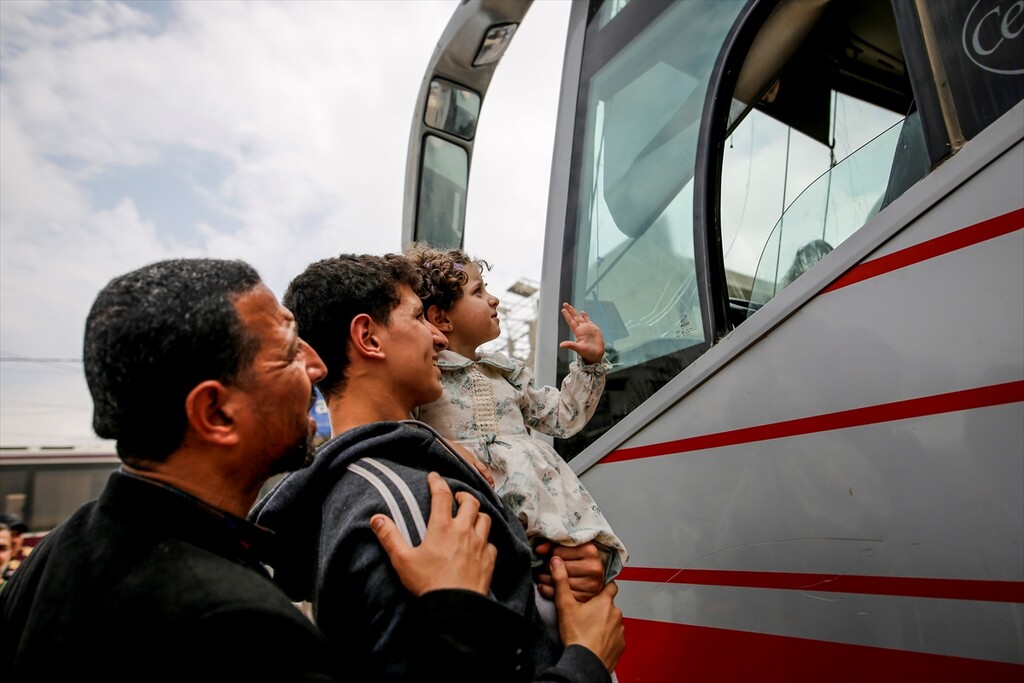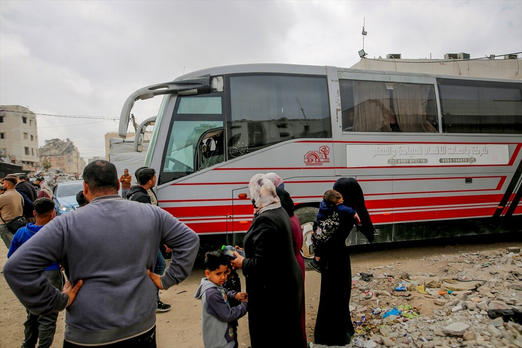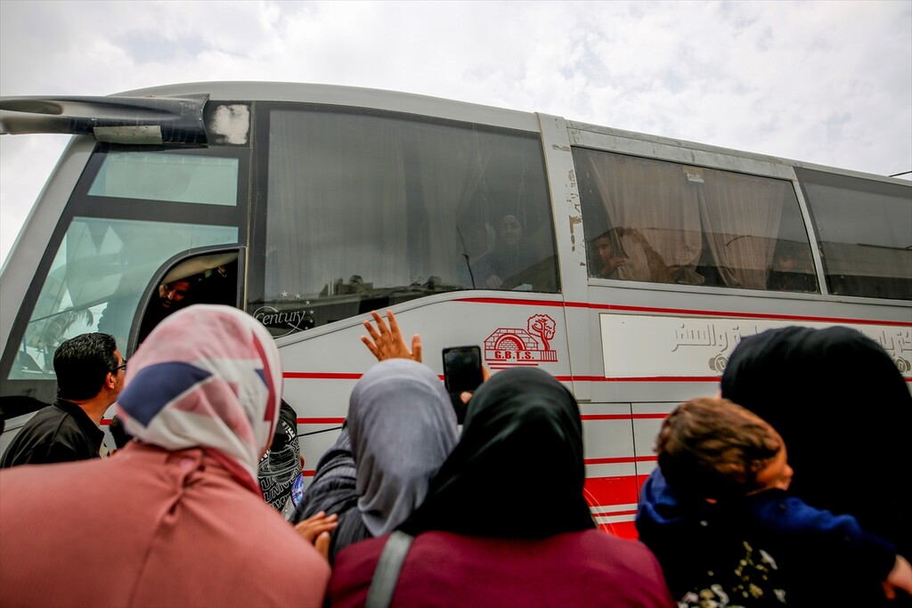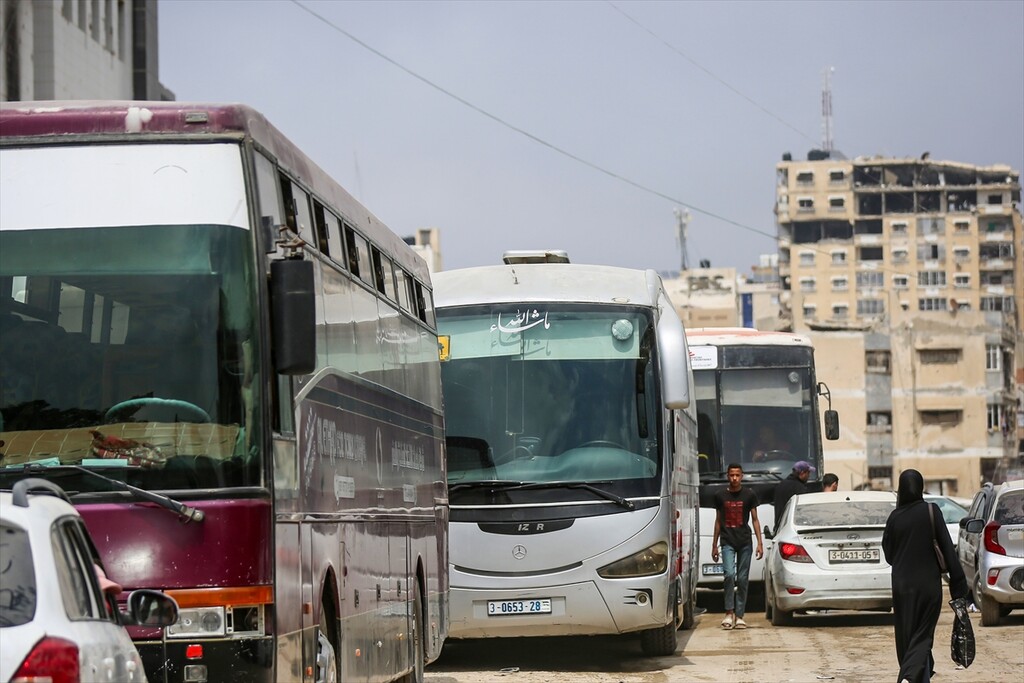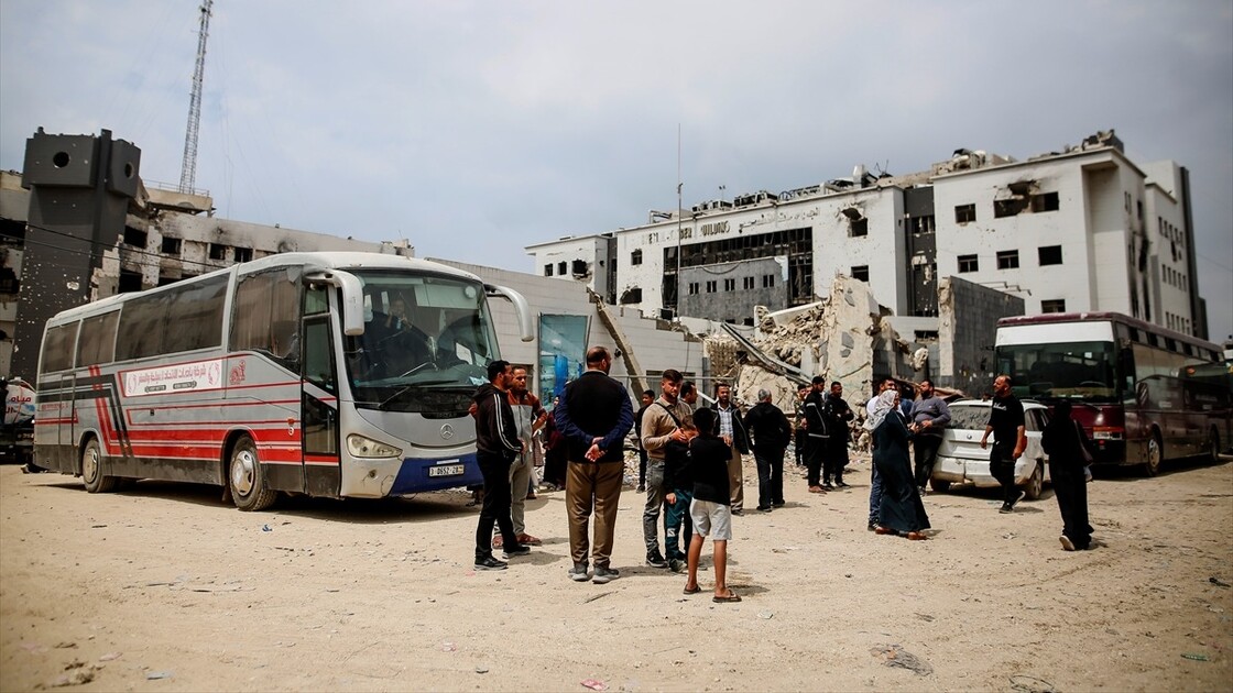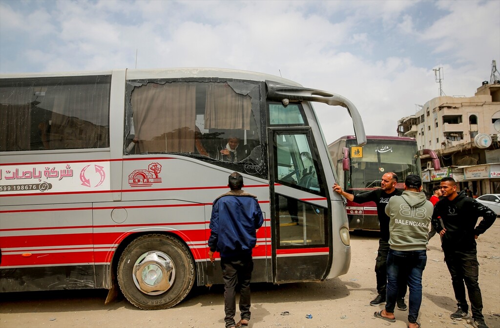 A group of Palestinian patients and their companions board buses in front of Al-Shifa Hospital to be evacuated to Jordan for medical treatment in coordination with World Health Organization (WHO) in Gaza City, Gaza on April 26, 2026.