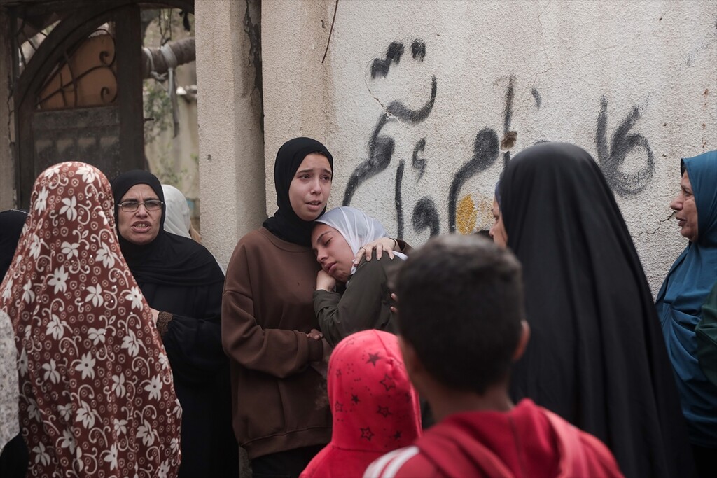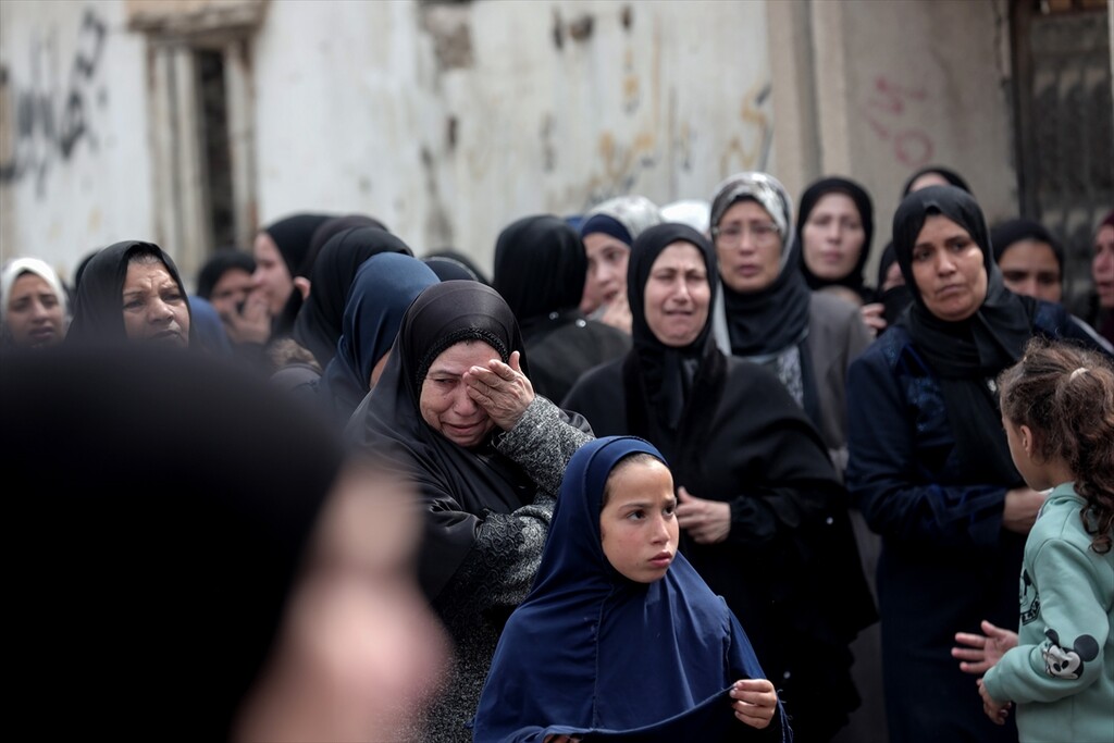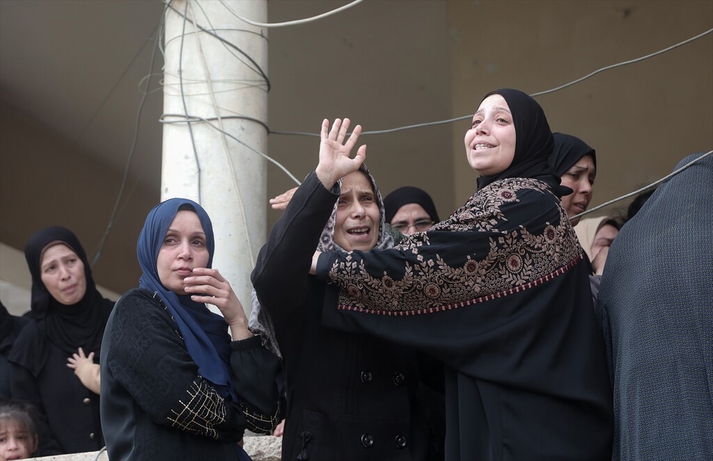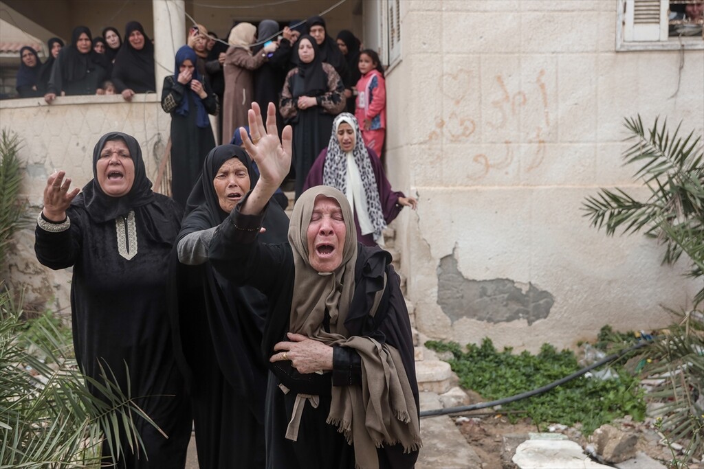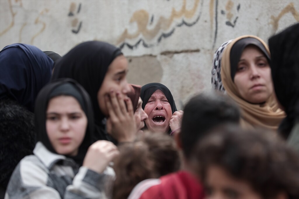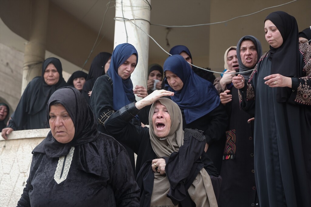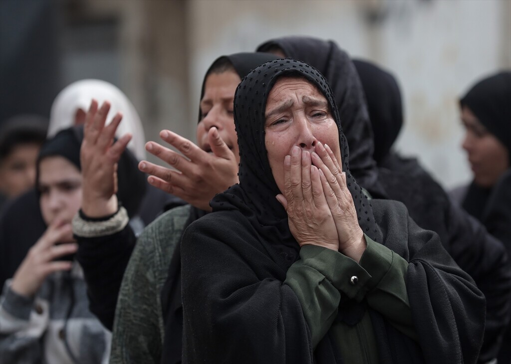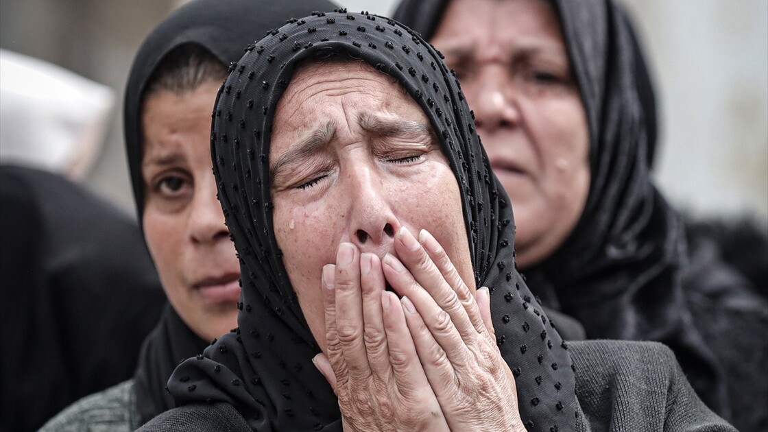 Palestinians who lost their relatives in an Israeli attack grieve during the funeral held outside their homes at Rimal neighborhood in Gaza City, Gaza, Palestine on April 14, 2026.