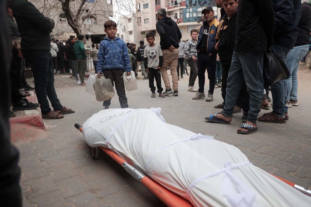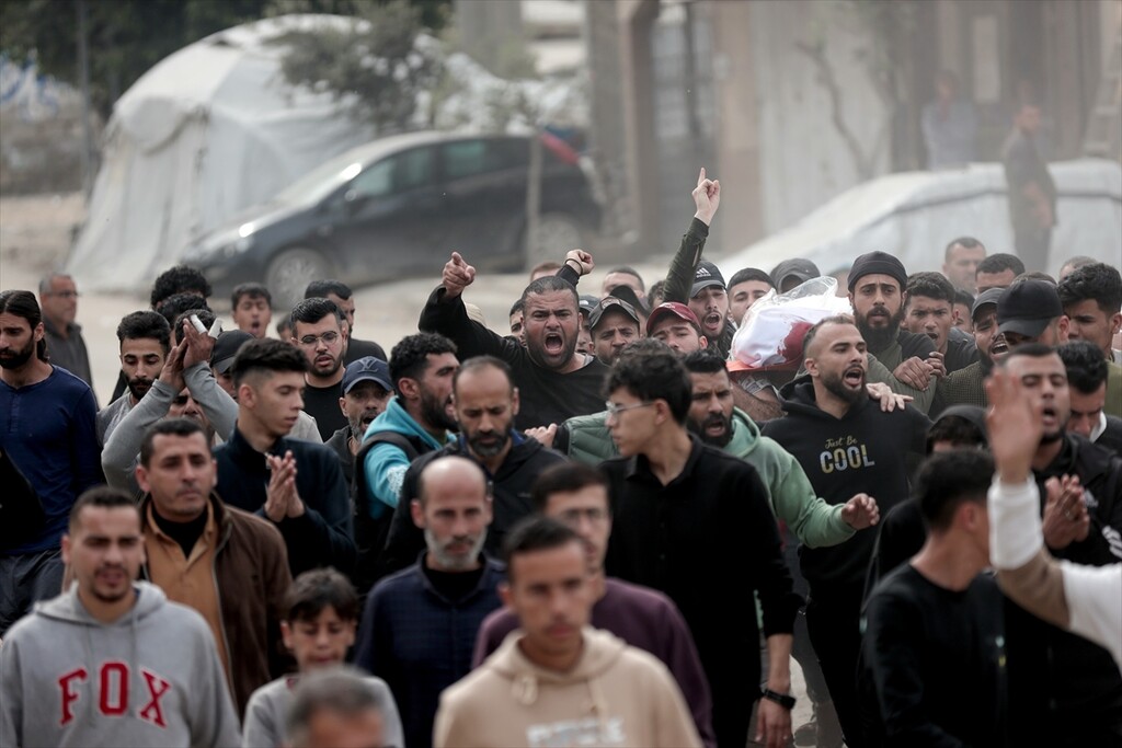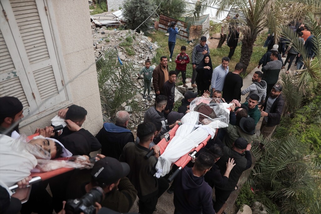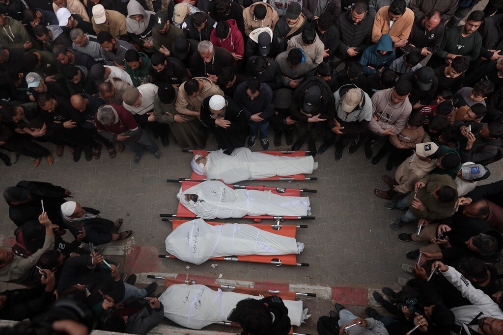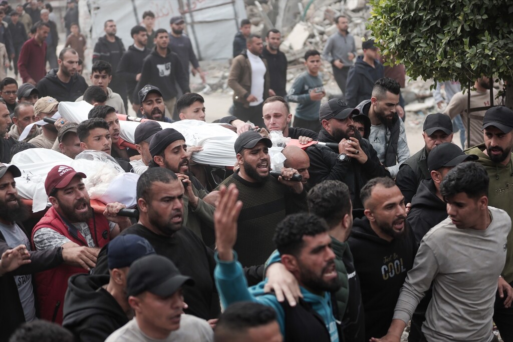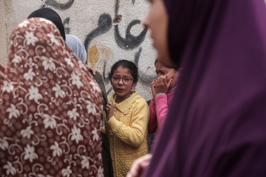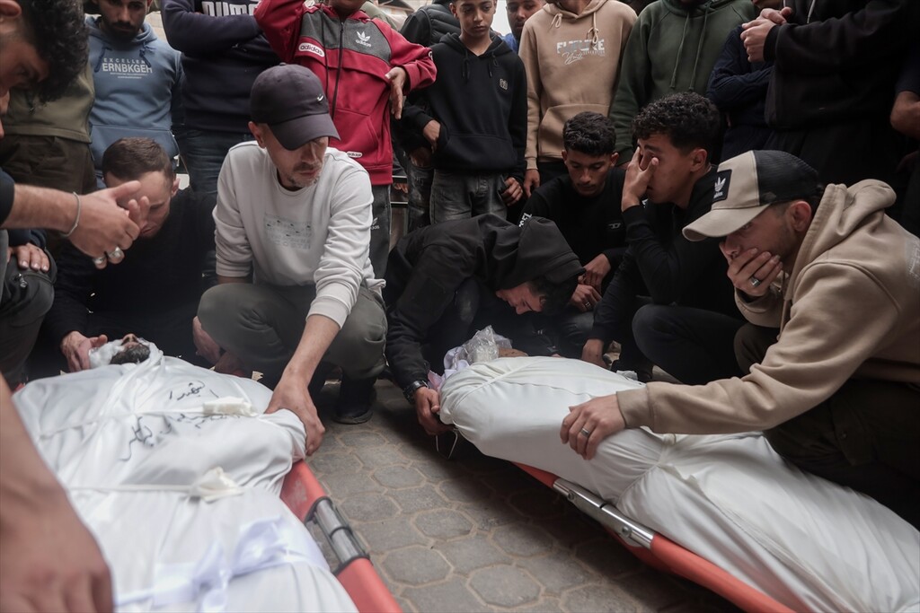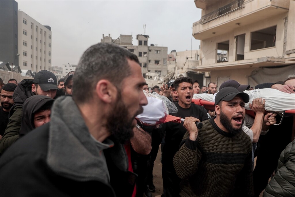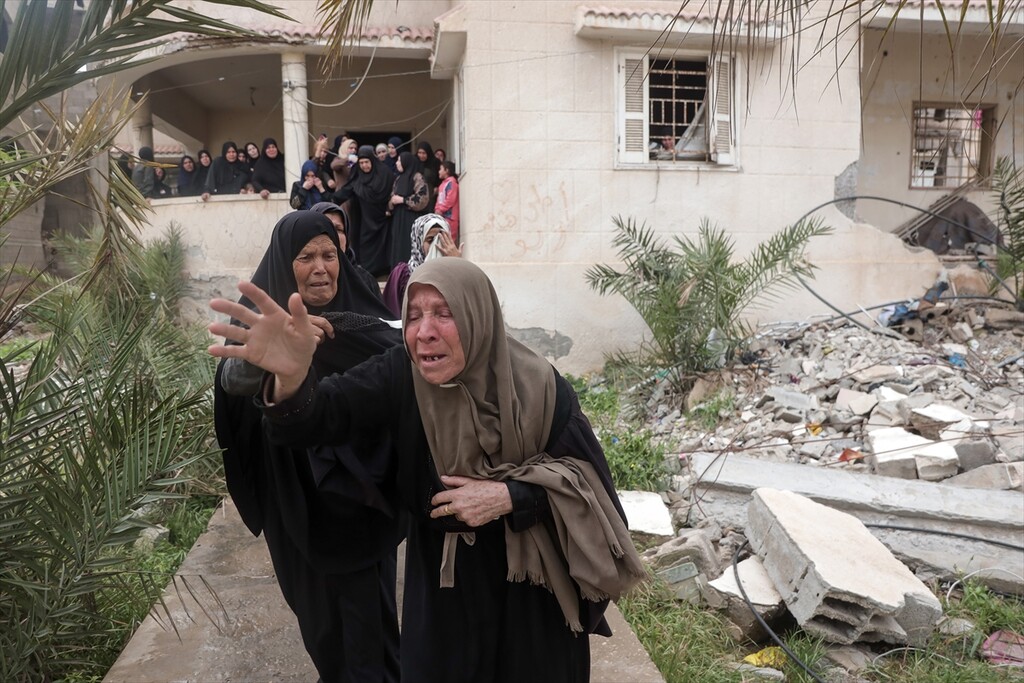 Palestinians who lost their relatives in an Israeli attack grieve during the funeral held outside their homes at Rimal neighborhood in Gaza City, Gaza, Palestine on April 14, 2026.