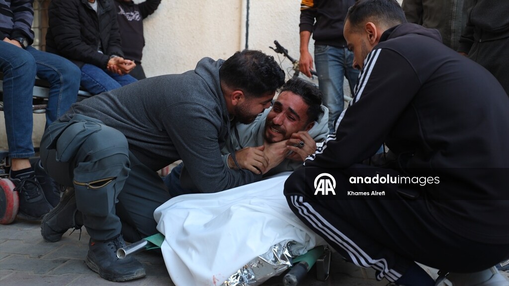 Palestinians mourn as bodies of those killed and injured after an Israeli army attack violating the ceasefire, are brought to Al-Shifa Hospital for funeral procedures, in Gaza City, Palestine, on April 9, 2026.