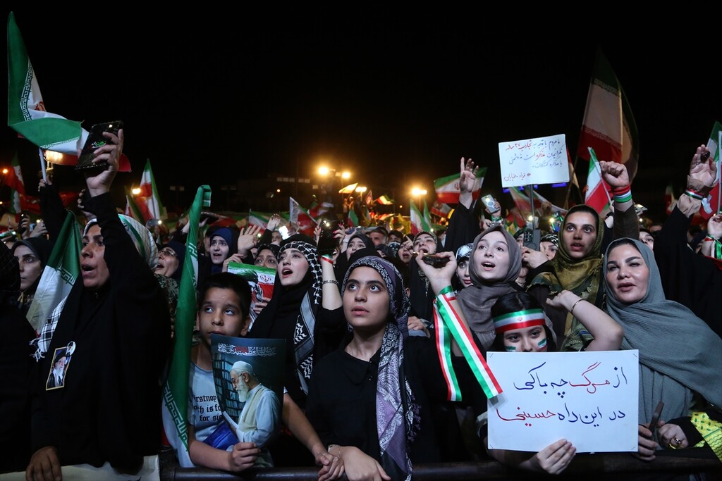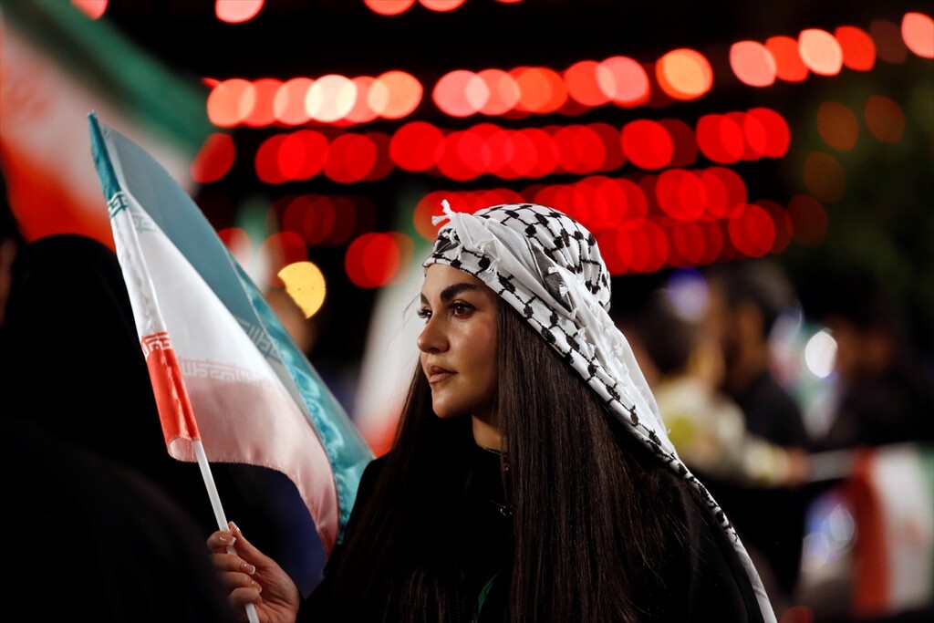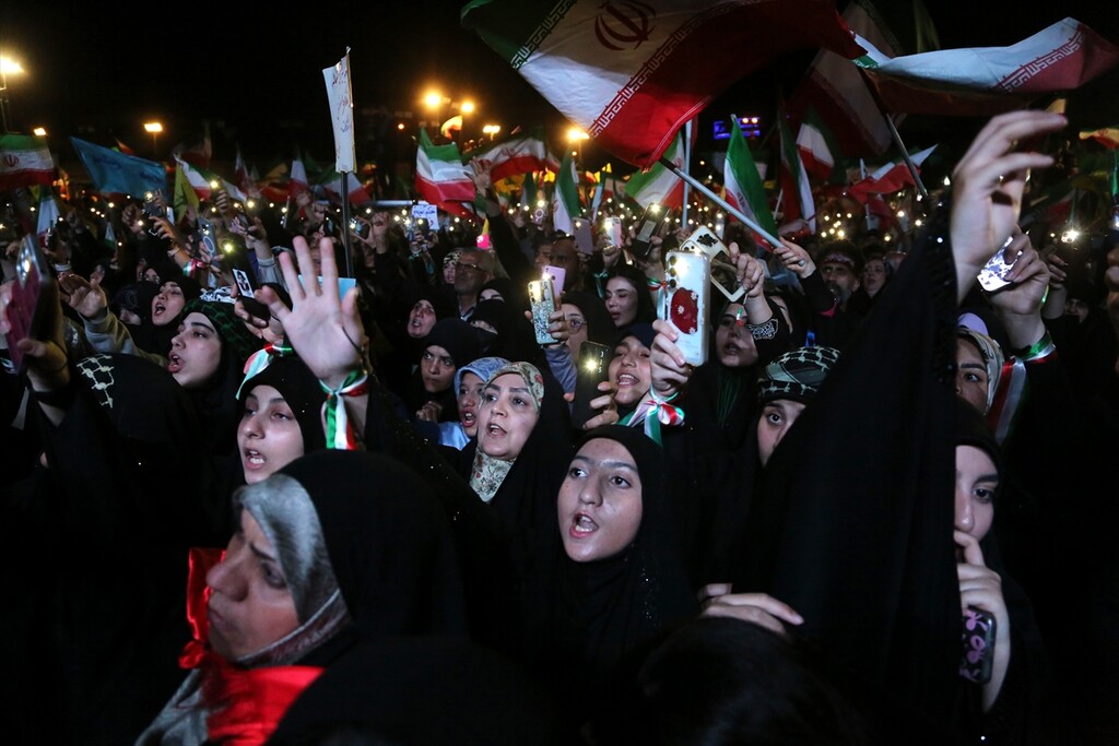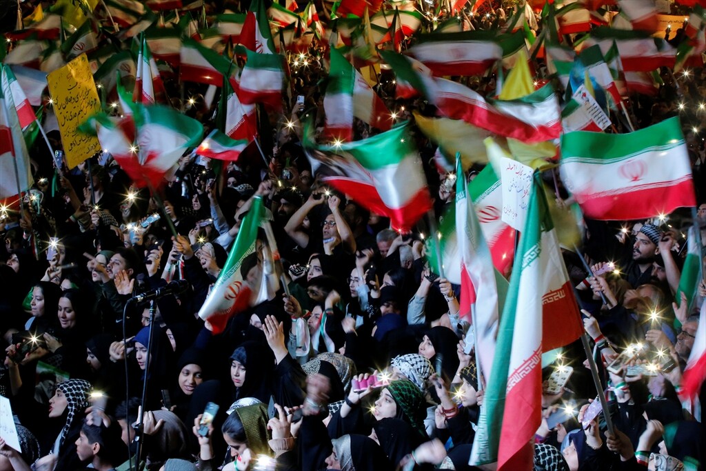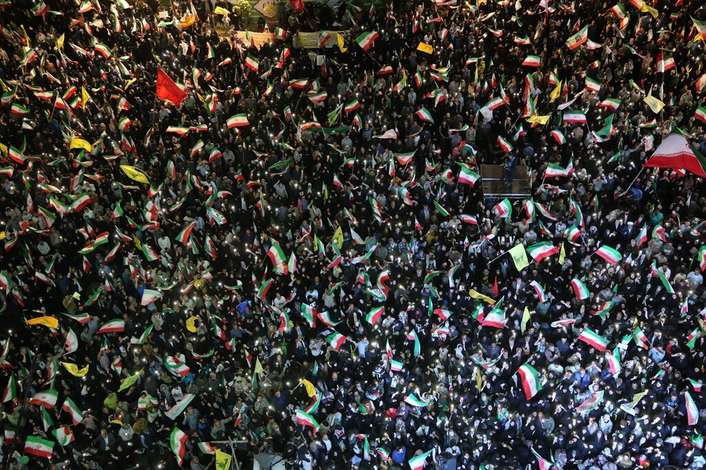 Thousands of people carrying Iranian flags, gathered in Revolution Square to protest against the United States and Israel, in Tehran, Iran on April 25, 2026.