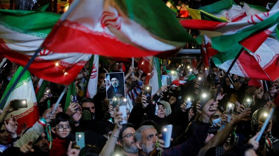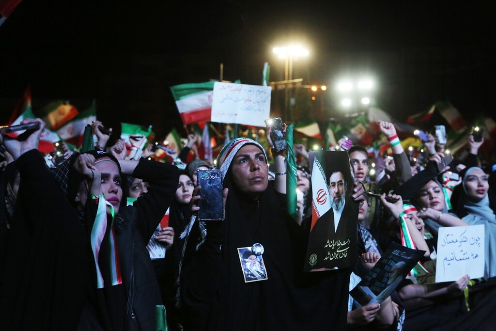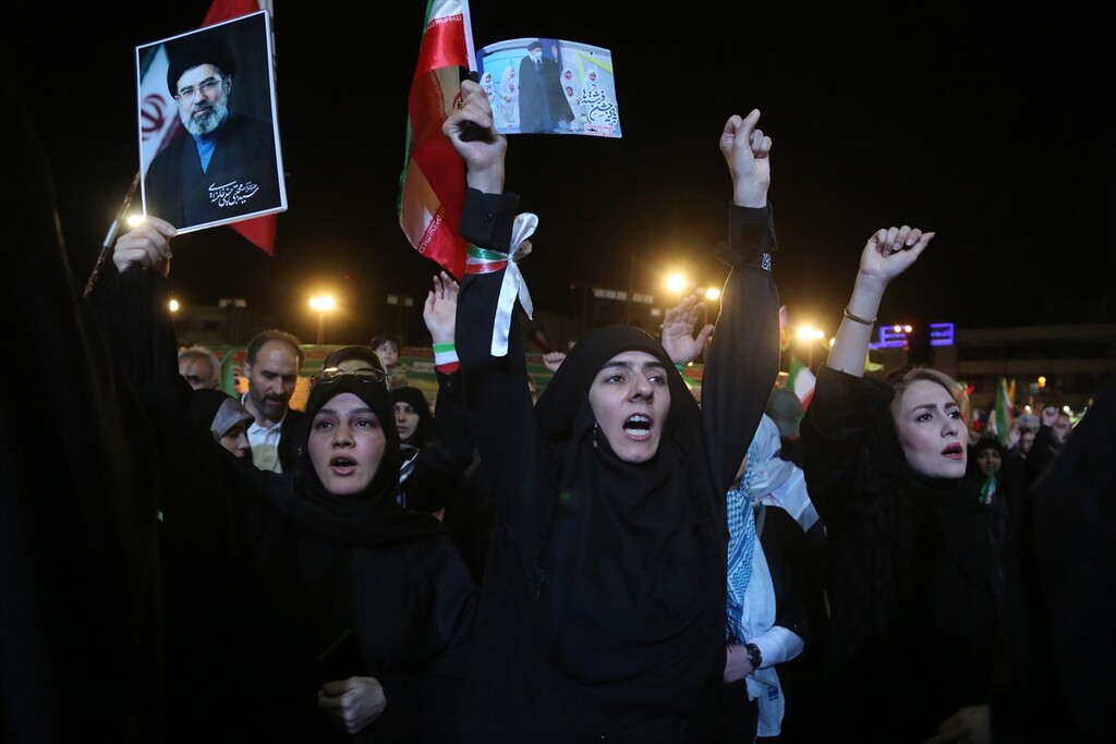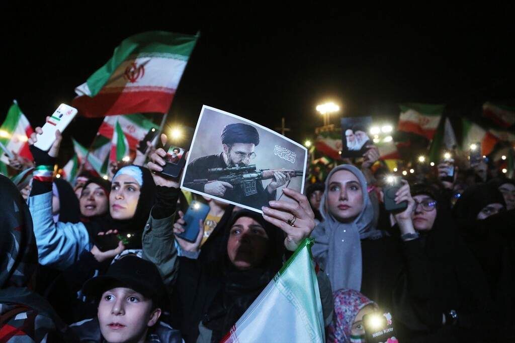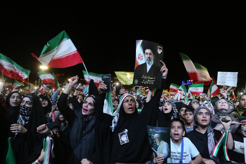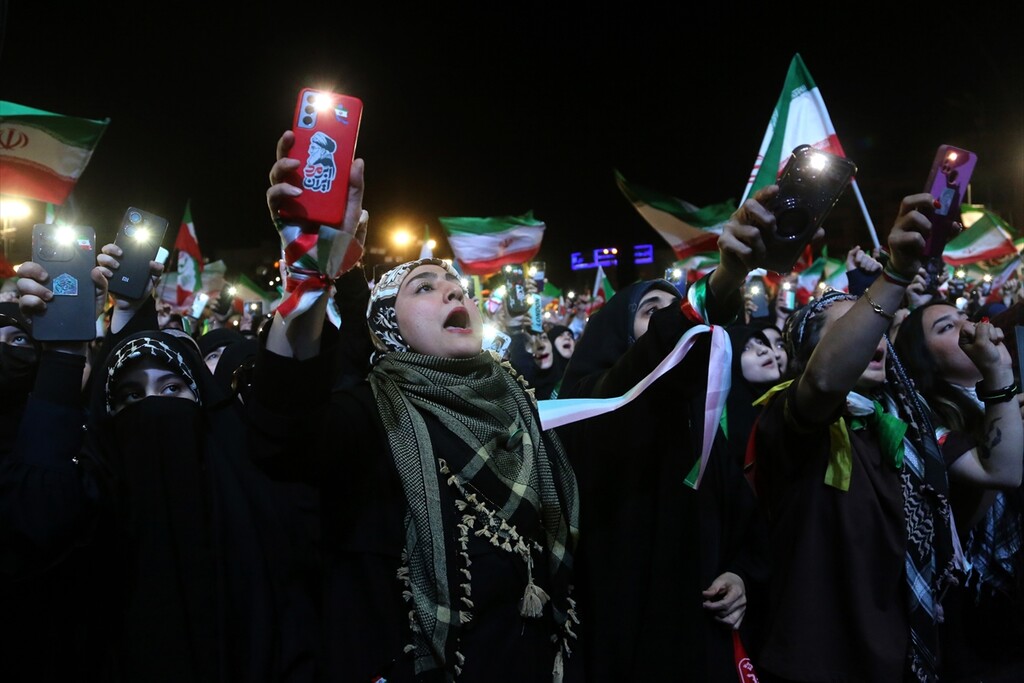 Thousands of people carrying Iranian flags, gathered in Revolution Square to protest against the United States and Israel, in Tehran, Iran on April 25, 2026.