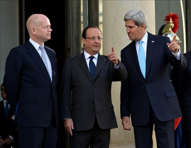 French President Francois Hollande received US Secretary of State John Kerry and British Foreign Secretary William Hague at Elysee Palace on Monday morning to talk about Syria draft resolution which would be presented to UN Security Council.