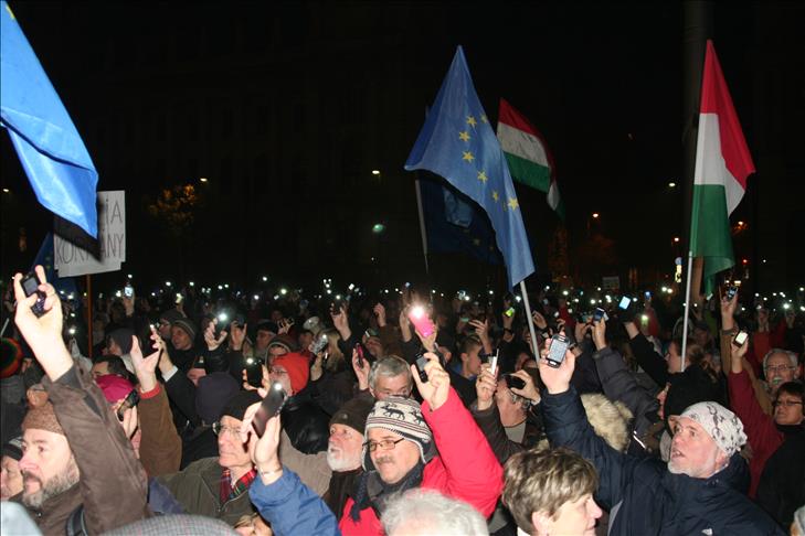 About 2,500 Hungarians demonstrated in front of the country's Parliament Building in Budapest on Sunday evening to protest government corruption, and budget cuts.