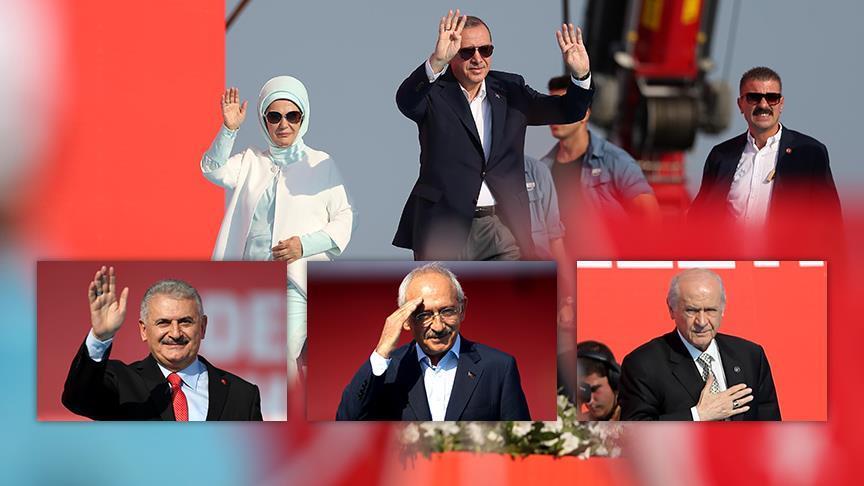 President Recep Tayyip Erdogan was joined by Prime Minister and ruling AK Party chairman Binali Yildirim, main opposition Republican People's Party (CHP) Chairman Kemal Kilicdaroglu, and Nationalist Movement Party (MHP) leader Devlet Bahceli at the massive “Democracy and Martyrs' Rally" in a show of national solidarity and a common protest against the July 15 defeated coup that left 240 people martyred and 2,200 others injured.