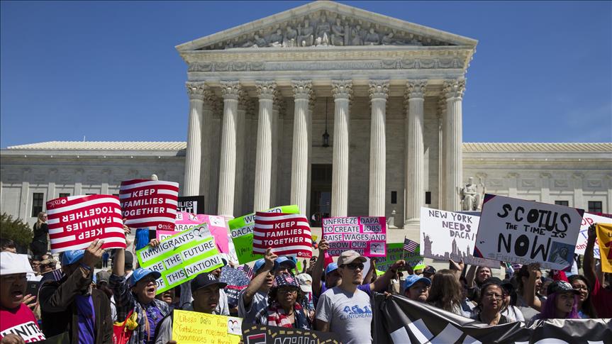 The top court is likely to be split 4-4 along ideological lines as hundreds of immigration advocates protested outside.