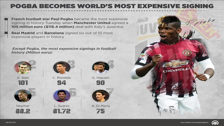 French football star Paul Pogba became the most expensive signing in history Tuesday when Manchester United agreed a 105 million euro ($116.4 million) deal with Italy’s Juventus.
