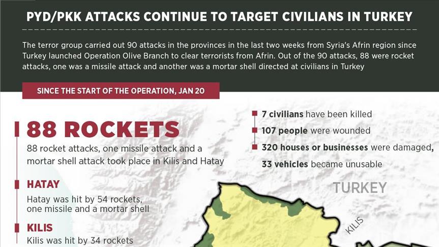 The terror group carried out 90 attacks in the provinces in the last two weeks from Syria's Afrin region since Turkey launched Operation Olive Branch to clear terrorists from Afrin.