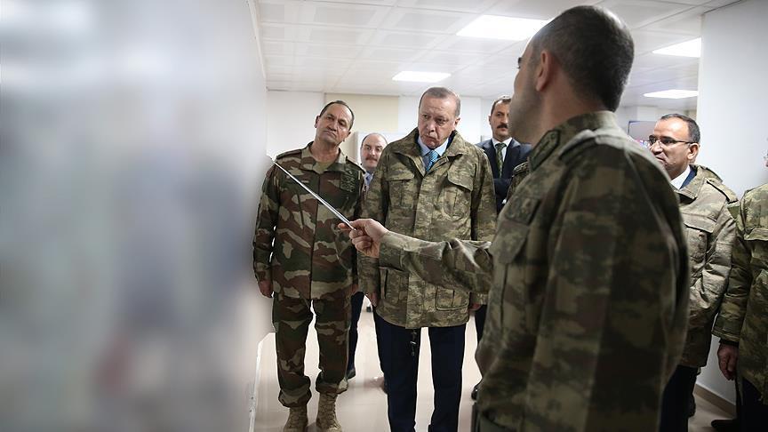 President Recep Tayyip Erdogan visited a military command center in southern Hatay province on Thursday as the ongoing operation in northern Syria entered its sixth day, according to a presidential source.