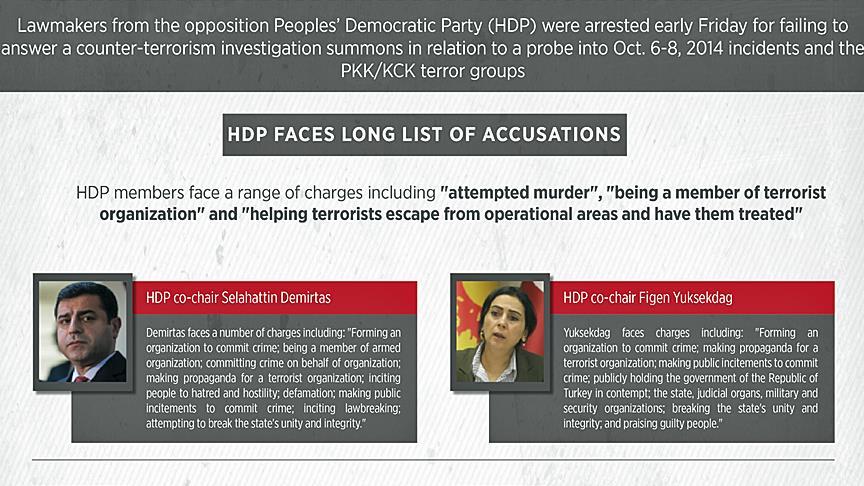 Friday's move came after prosecutors in Turkey’s east and southeast ordered the arrests of the party co-leaders, Figen Yuksekdag and Selahattin Demirtas, along with 13 other HDP deputies, according to an Interior Ministry statement.