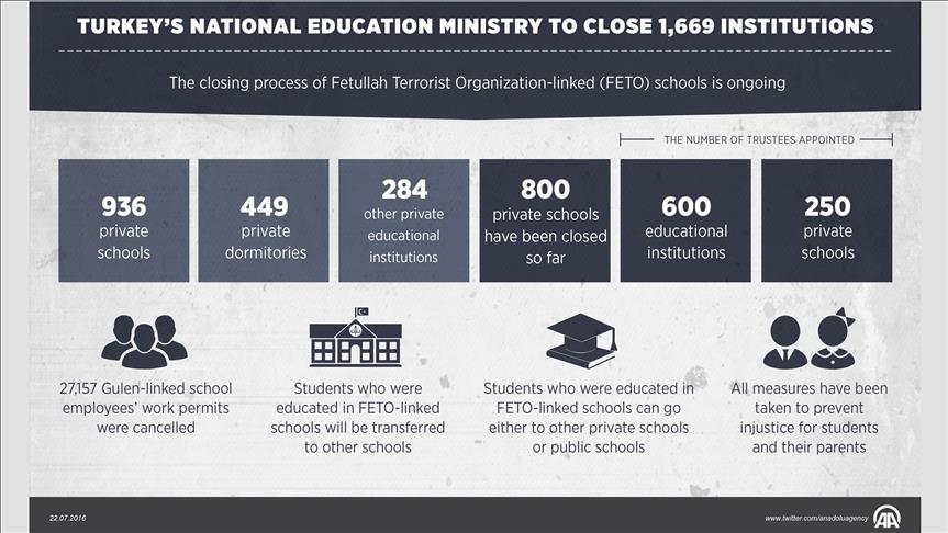 The ministry had already closed 800 FETO-linked schools before the July 15 coup attempt while Turkey’s courts had decided to appoint trustees for 250 private schools and 600 other educational institutions linked to U.S.-based preacher Fetullah Gulen.