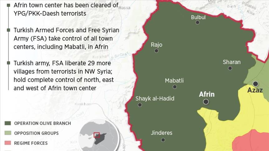 Turkish Armed Forces and Free Syrian Army took control of the Afrin town center early on Sunday as part of Operation Olive Branch, which was launched on Jan. 20 to clear the area of YPG/PKK-Daesh terrorists.