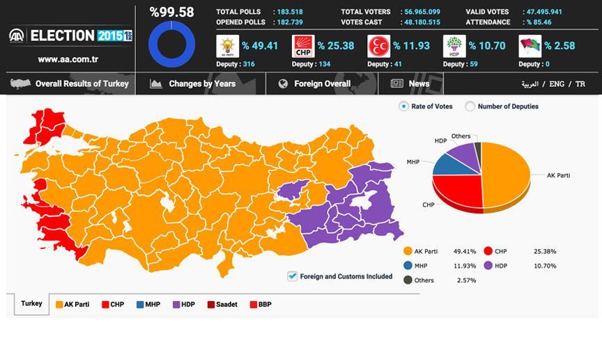 With 99.58 percent of votes counted, the AK Party led with 49.41 percent votes (316 seats), followed by the Republican People's Party (CHP) on 25.38 percent (134 seats).