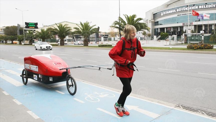 Sharing a video of her running on the Galata Bridge, which spans the Golden Horn, an ancient harbor in the city, she tweeted: “Is it a bird? Is it a plane? No! It's me running across Galata Bridge on a 6,000-mile journey across the world from the UK to Nepal, pulling everything I own in a cart behind me.”