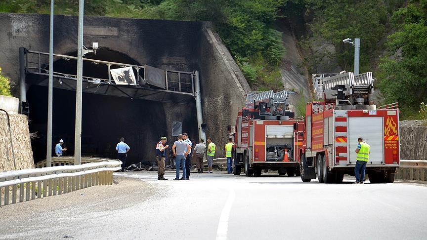 An articulated truck carrying paint-thinner burst into flames after it crashed into the guard rail at the entrance to a highway tunnel near Mengen, a town around 170 kilometers (105 miles) north of the capital Ankara, a gendarmerie officer said on condition of anonymity due to restrictions on talking to the media.