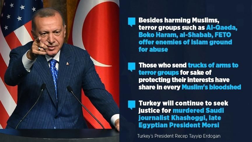 Speaking about terror groups, the Turkish president said that besides harming Muslims, the groups such as Al-Qaeda, Boko Haram, al-Shabab and FETO provide enemies of Islam ground for abuse.