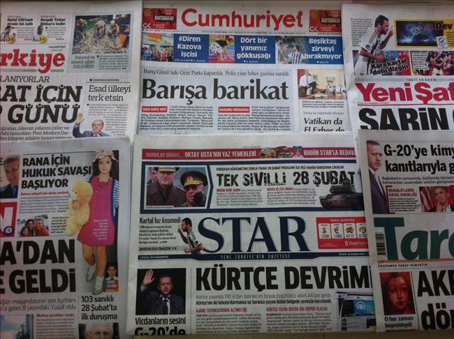 - Turkish dailies covered on Monday AA's launch of Kurdish broadcasting, international responses to developments on Syria, the Turkish PM's criticisms towards the UN and warnings to Assad, the start of the "post-modern" Feb 28 coup case and Sept. 1 peace day protests.